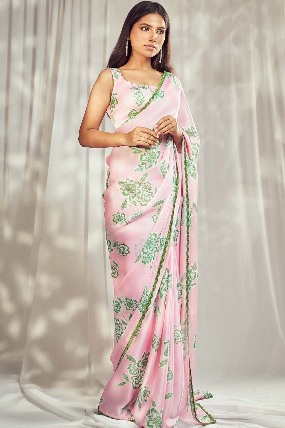 Baby Pink print saree with lace detailing paired with matching self scallop blouse.