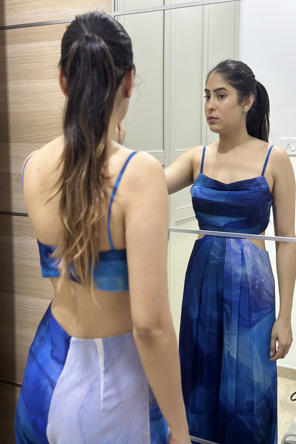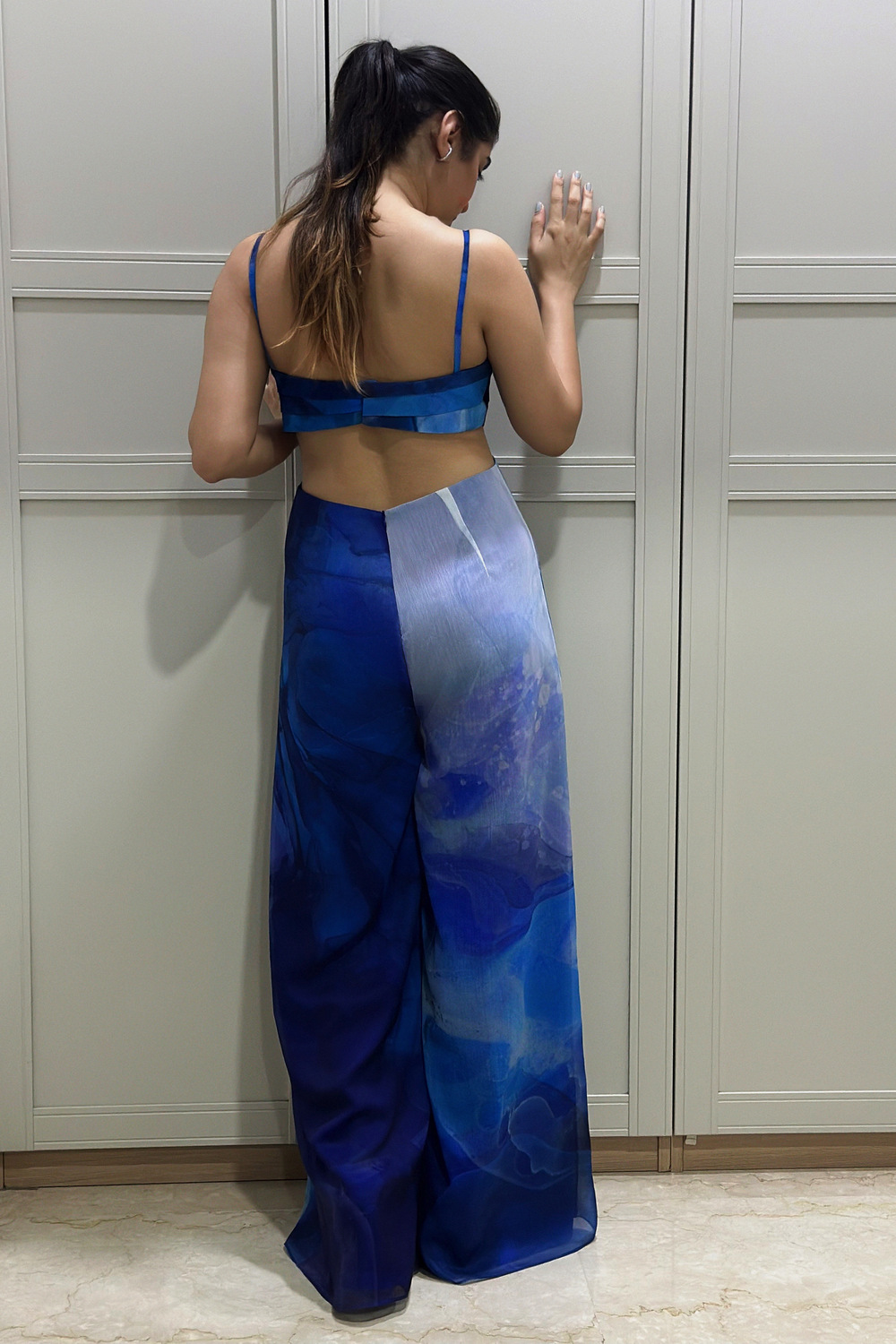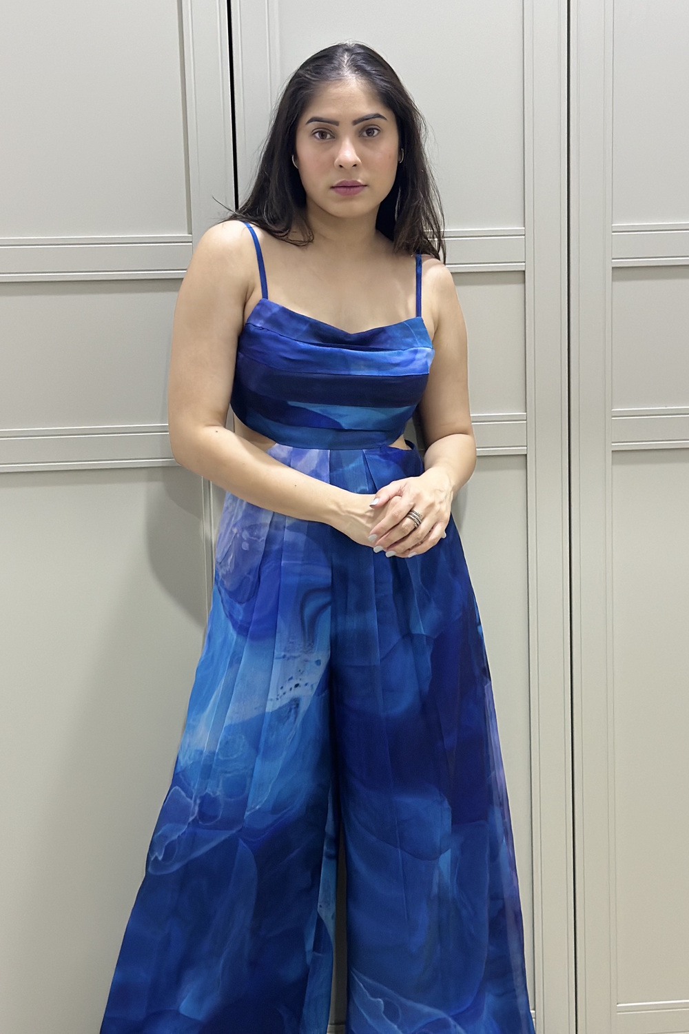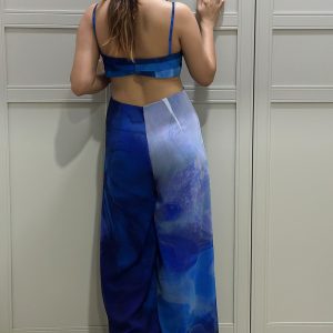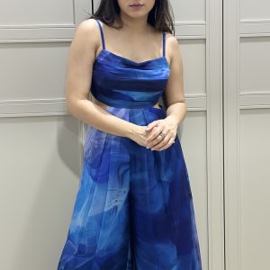 Blue printed jumpsuit with pleats on body.