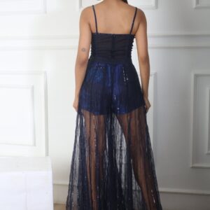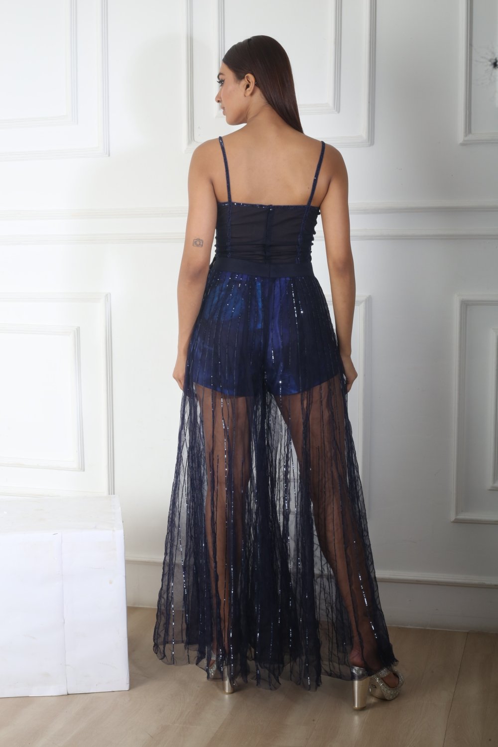 Midnight Blue sequin embellished corset with printed shorts and midnight blue heavy sequin embellished net palazzo pants.
