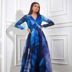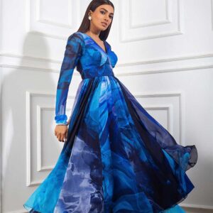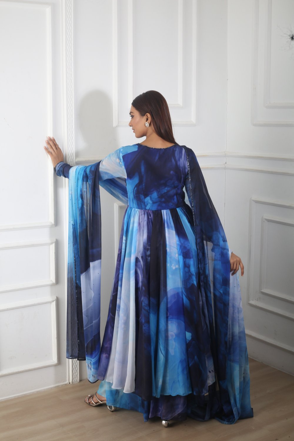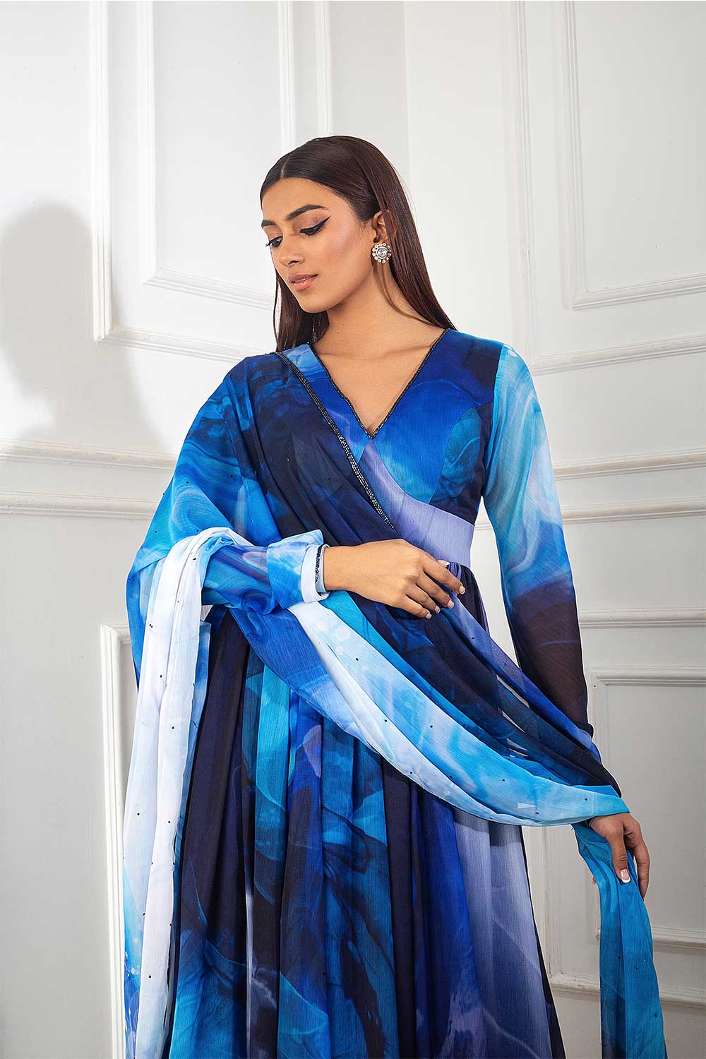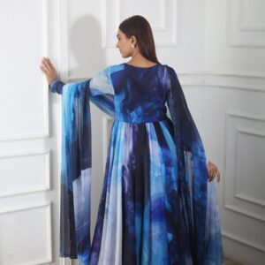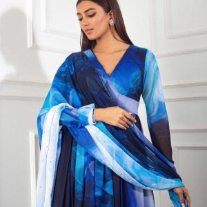 Blue printed churidar anarkali with cutdana embellished neckline, blue printed palazzo and matching blue print cutdana and sequin embellished dupatta.