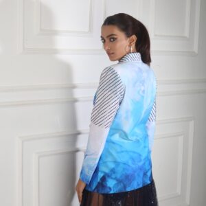 Blue printed bralette with white and blue printed sequin embellished blazer, blue printed shorts and midnight blue heavy sequin embellished net skirt.