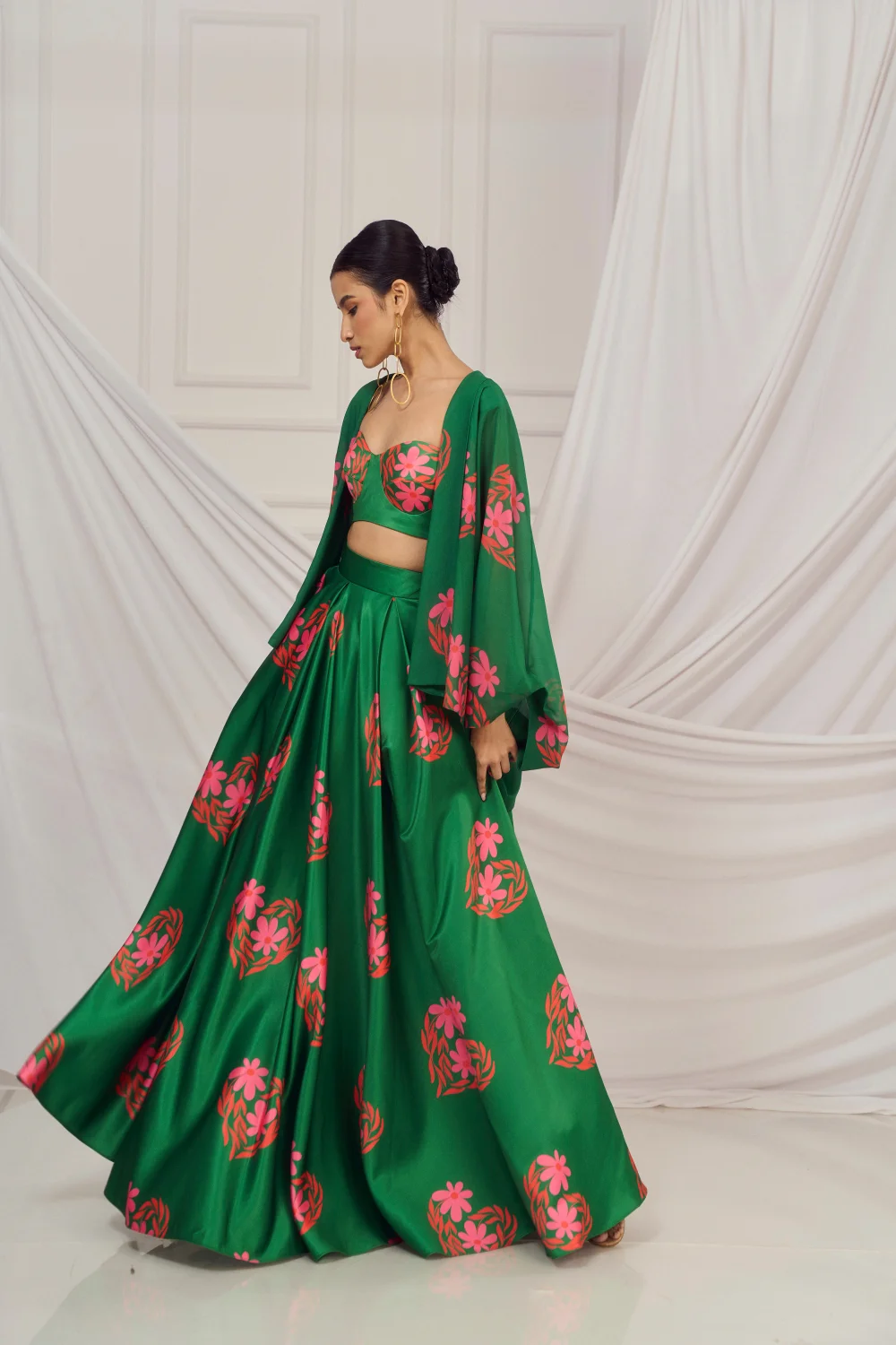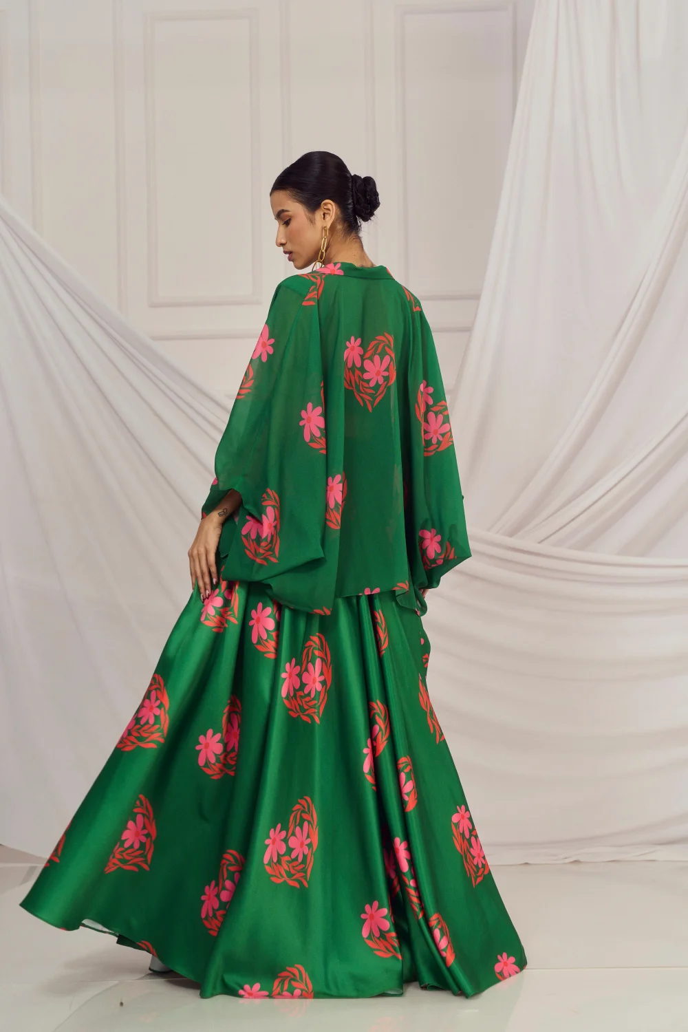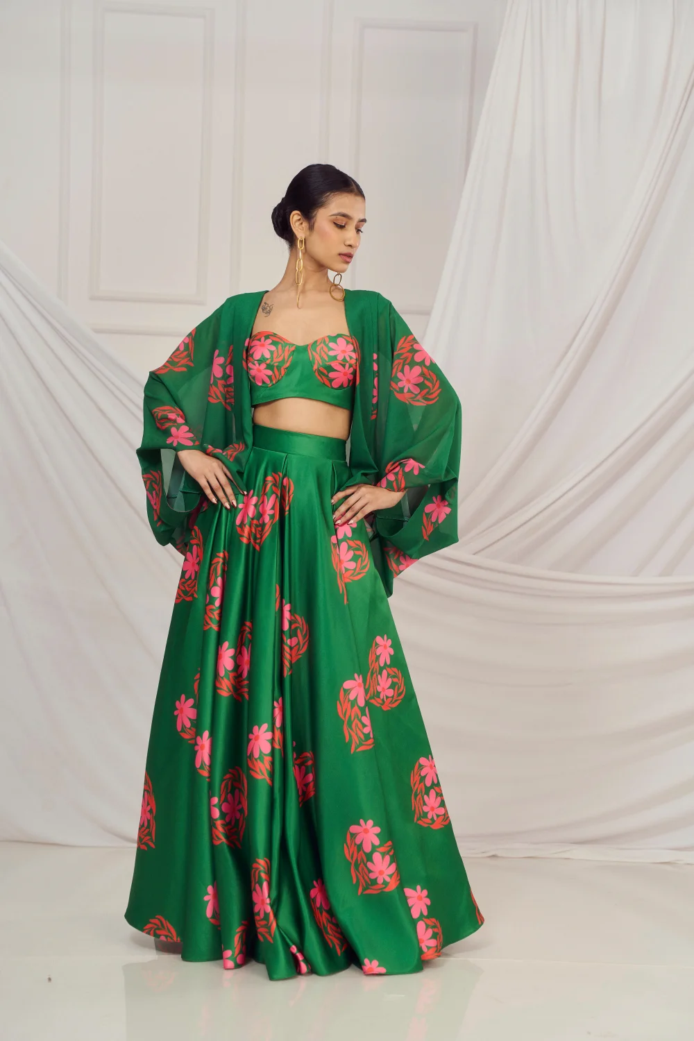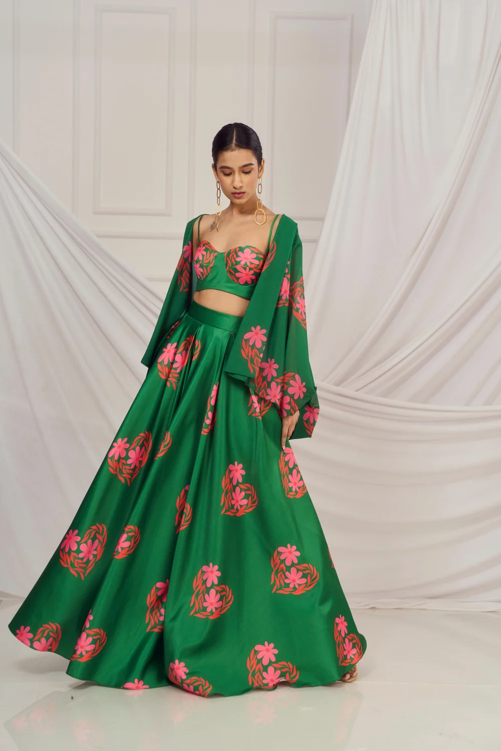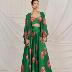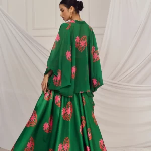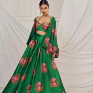 Dark Green floral heart blouse and lehenga paired with matching kaftan shrug.