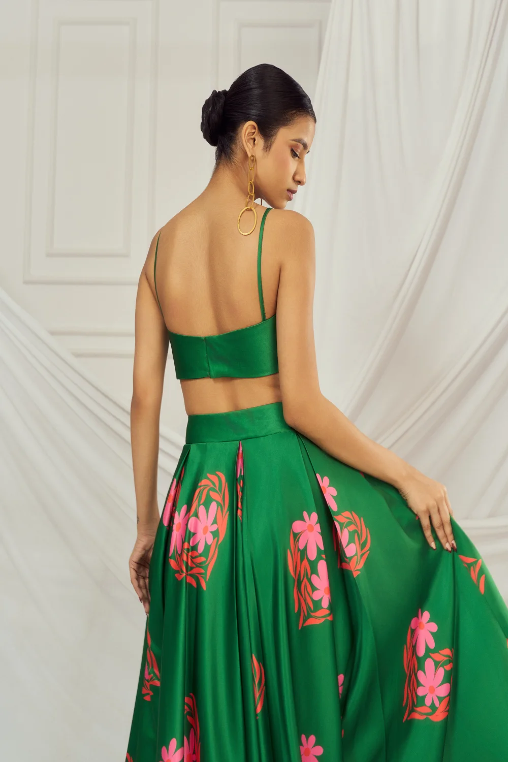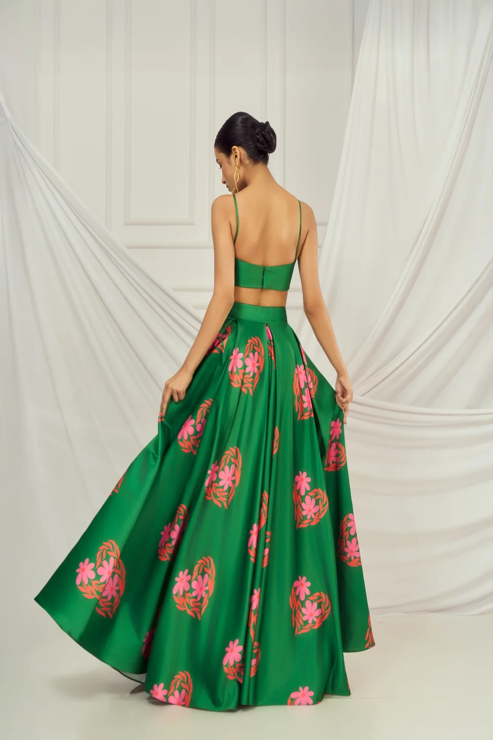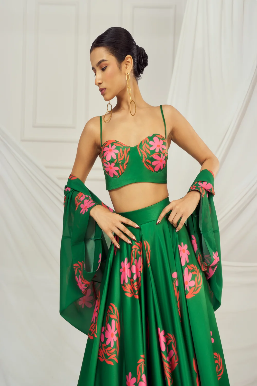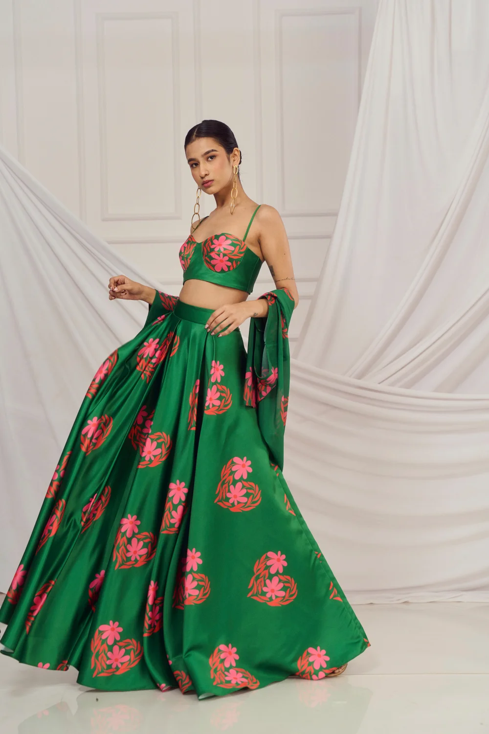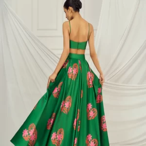 Dark Green floral heart blouse and lehenga paired with matching kaftan shrug.