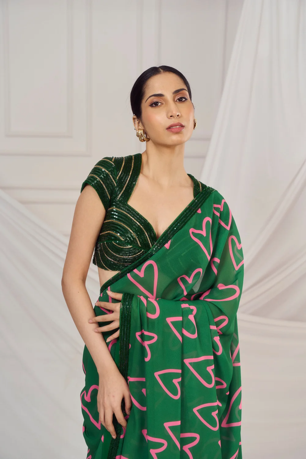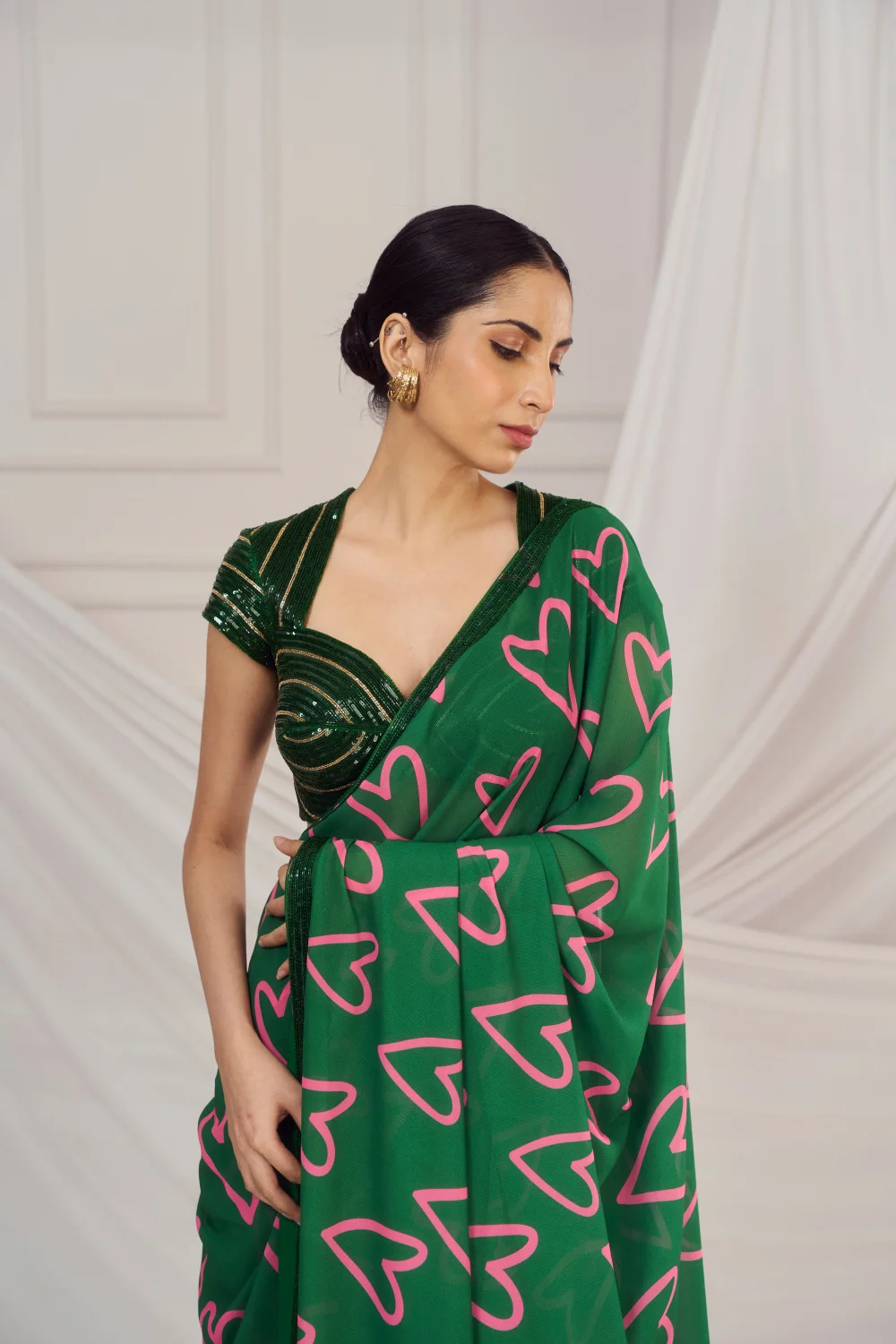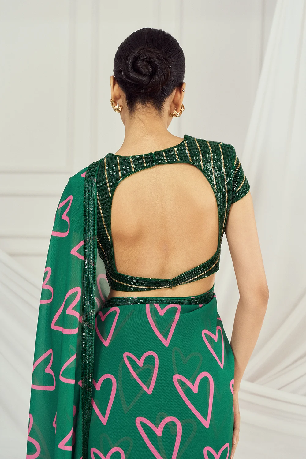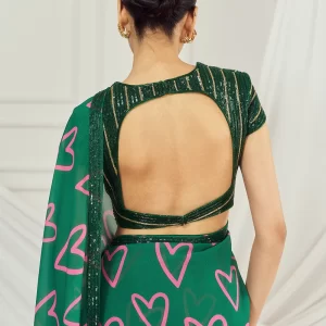 Dark green heart embroidered sari paired with matching dark green cutdana embroidered blouse with hint of gold cutdana work.