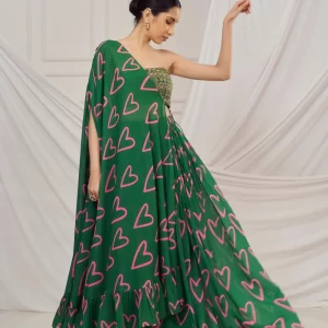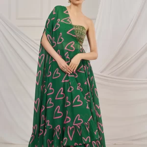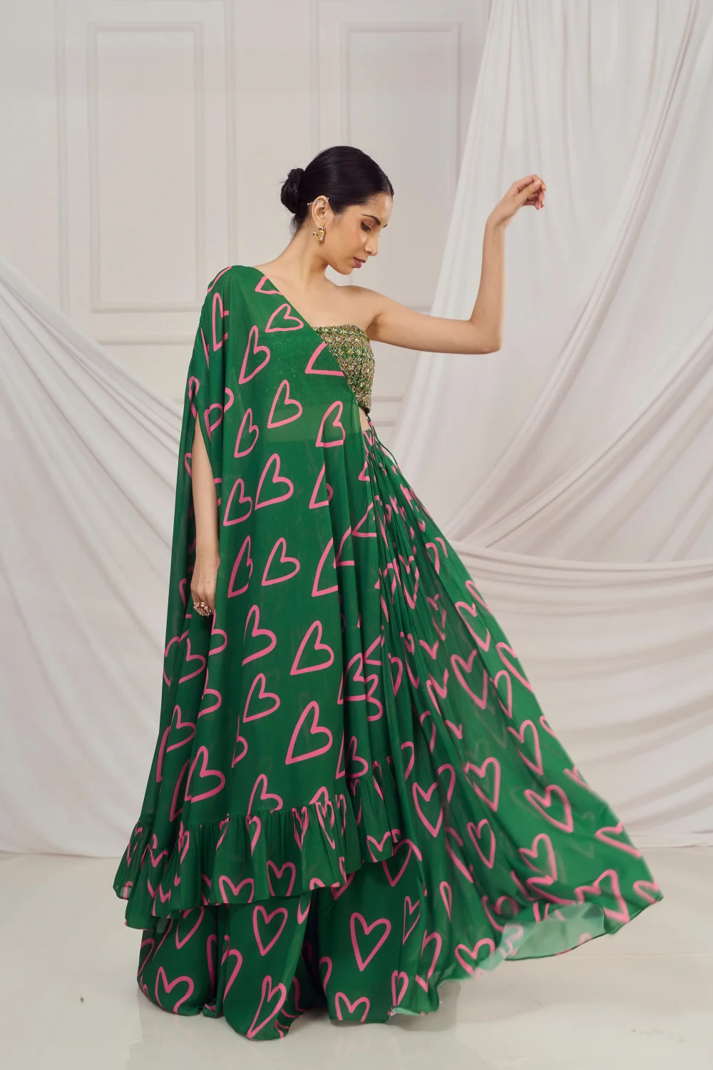 Dark Green heavy embroidered tube blouse paired with dark green heart lehenga and one shoulder cape set.