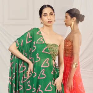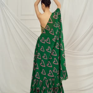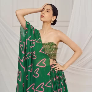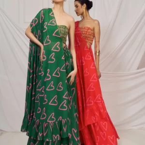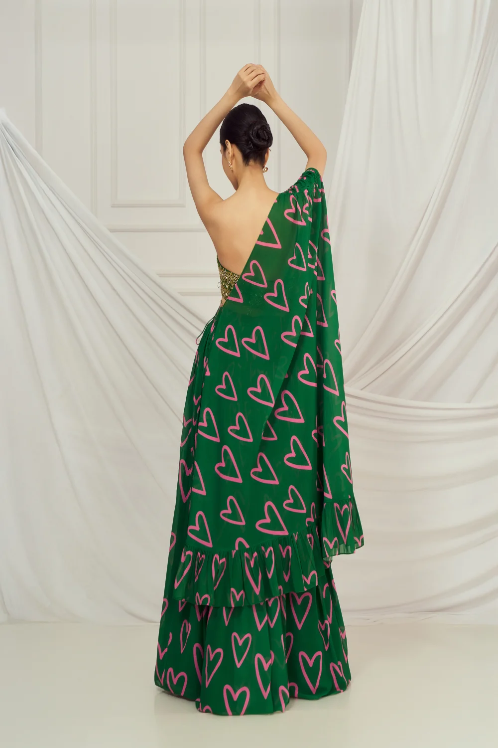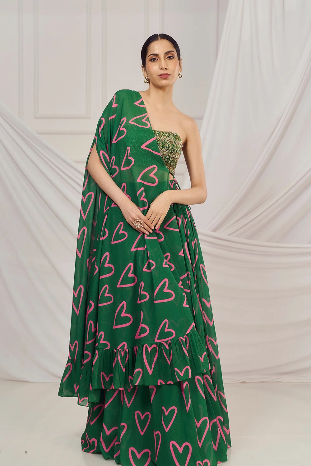 Dark Green Heavy Embroidered Tube Blouse paired with Dark Green Heart Glitter Georgette Skirt and Cape