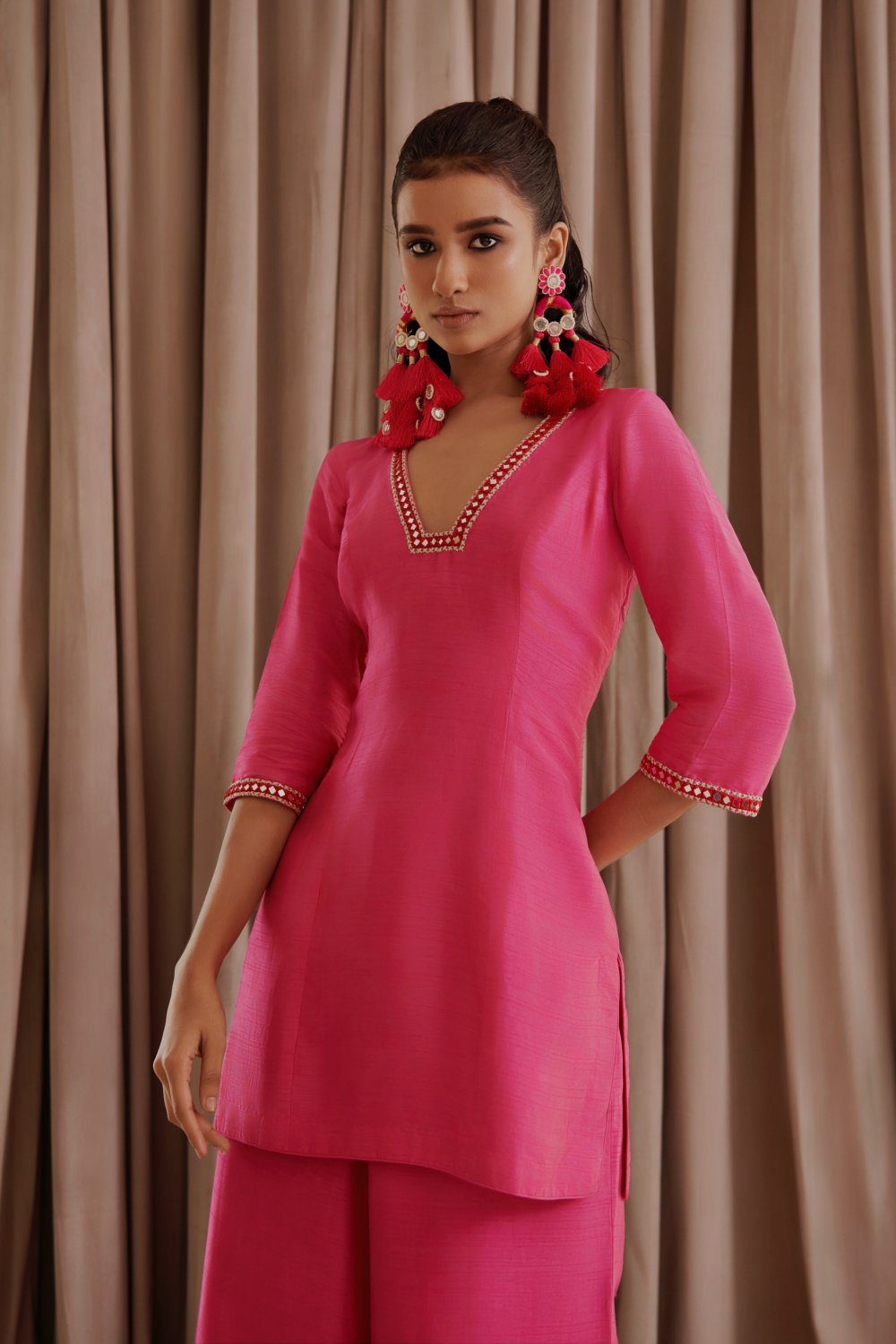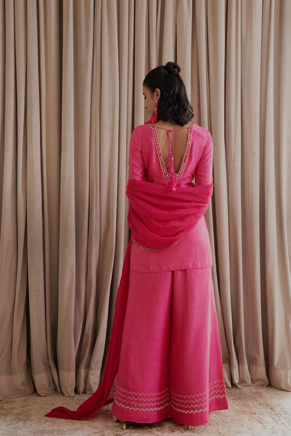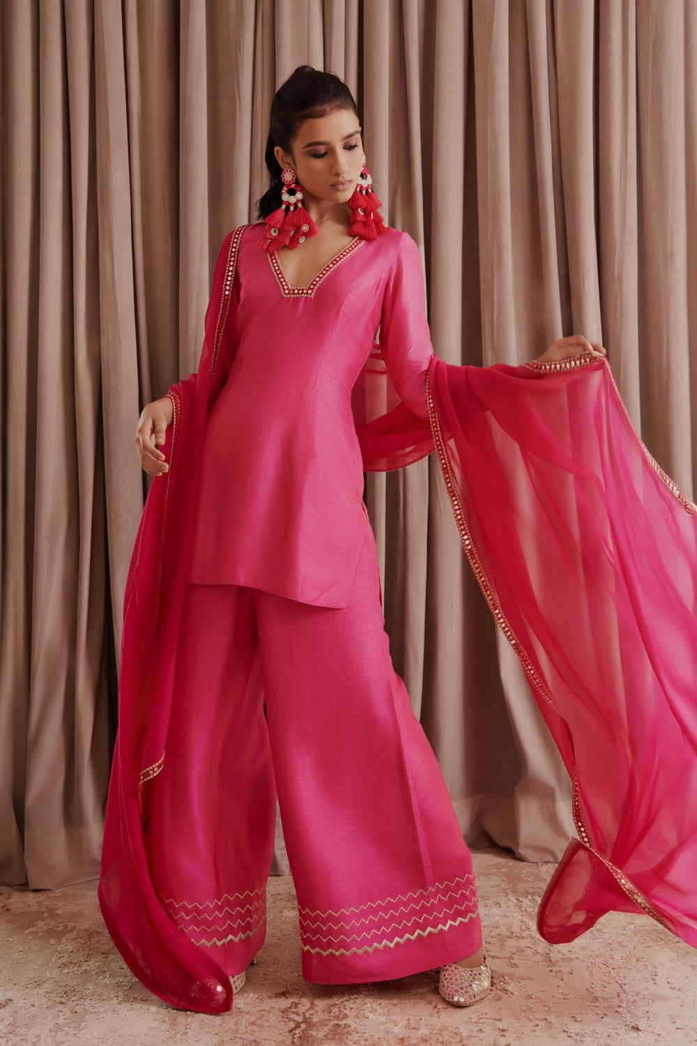Hot pink mirror work silk short kurti with matching kasab thread embroidery palazzo and rani pink mirror work organza dupatta.