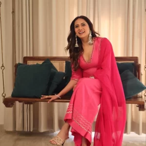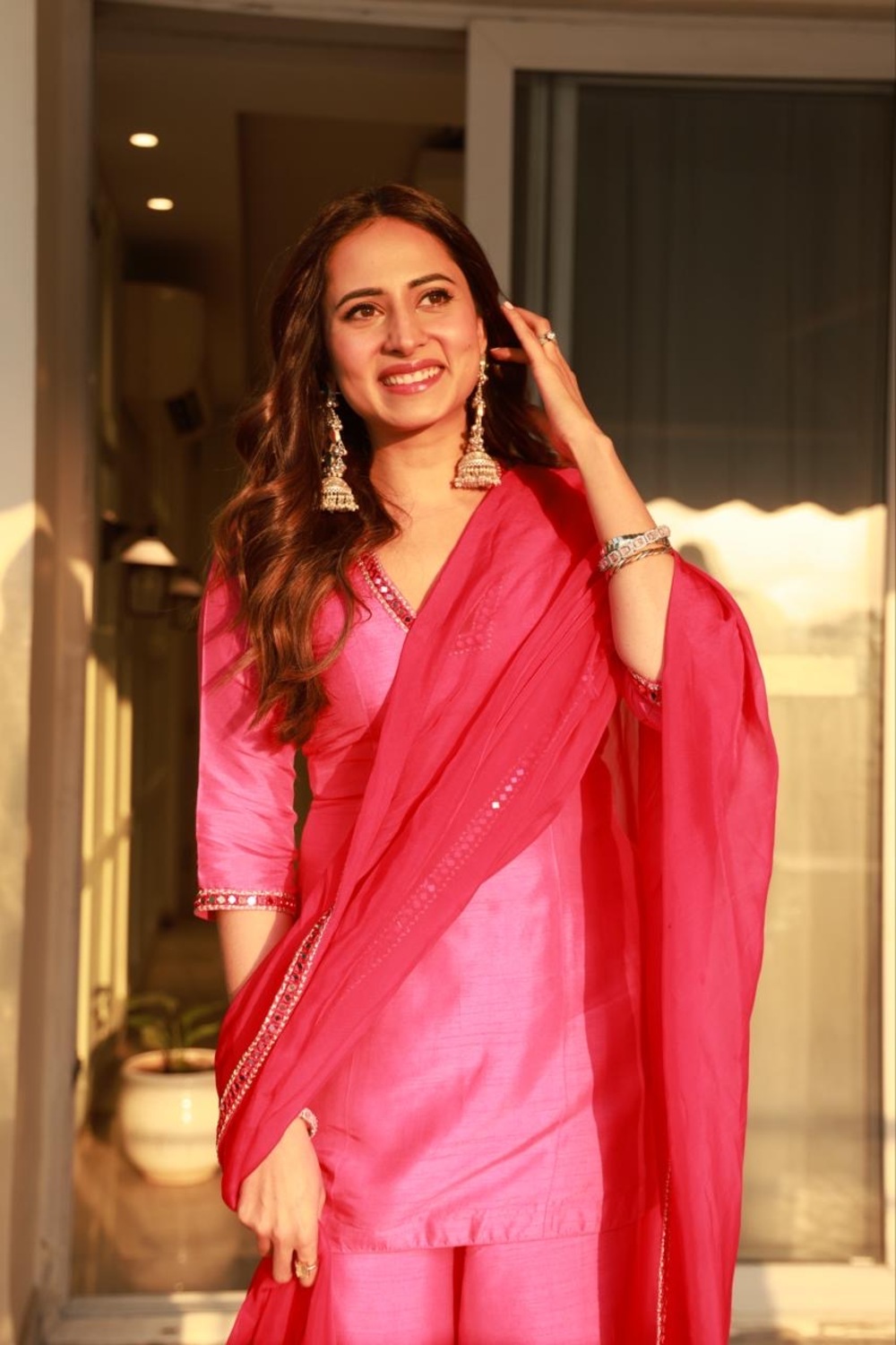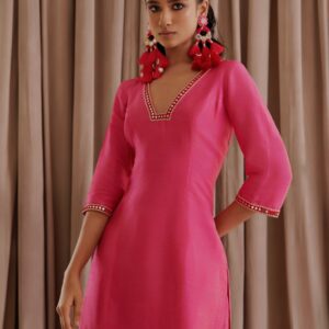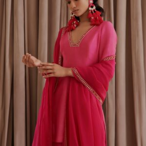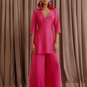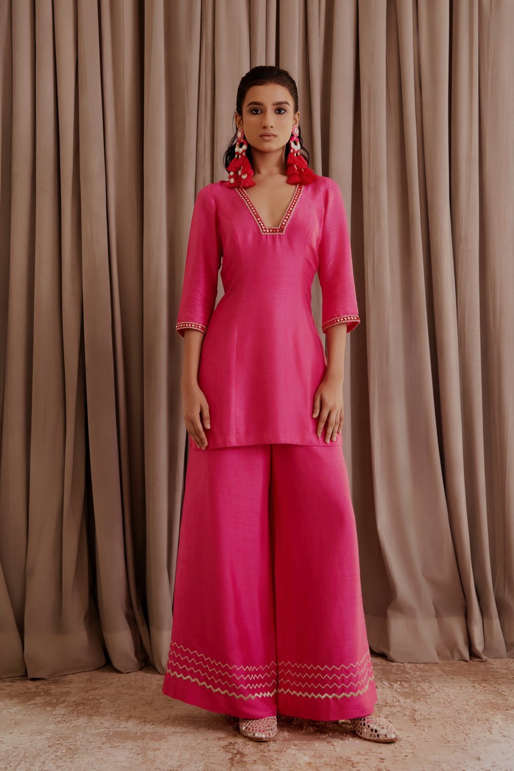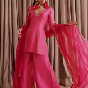 Hot pink mirror work silk short kurti with matching kasab thread embroidery palazzo and rani pink mirror work organza dupatta.