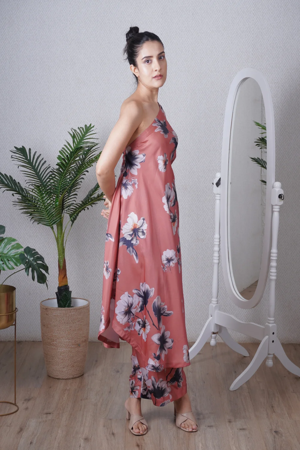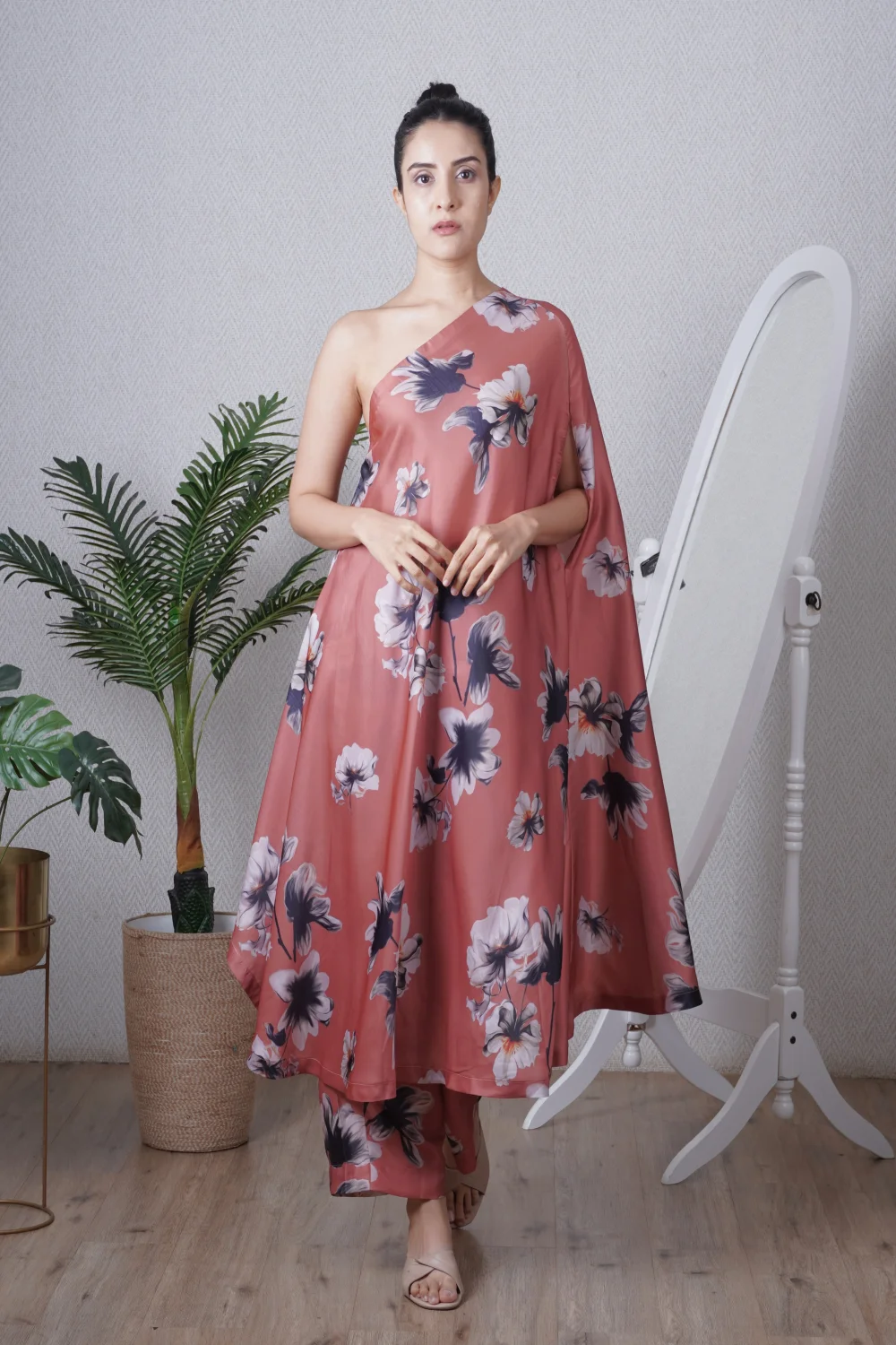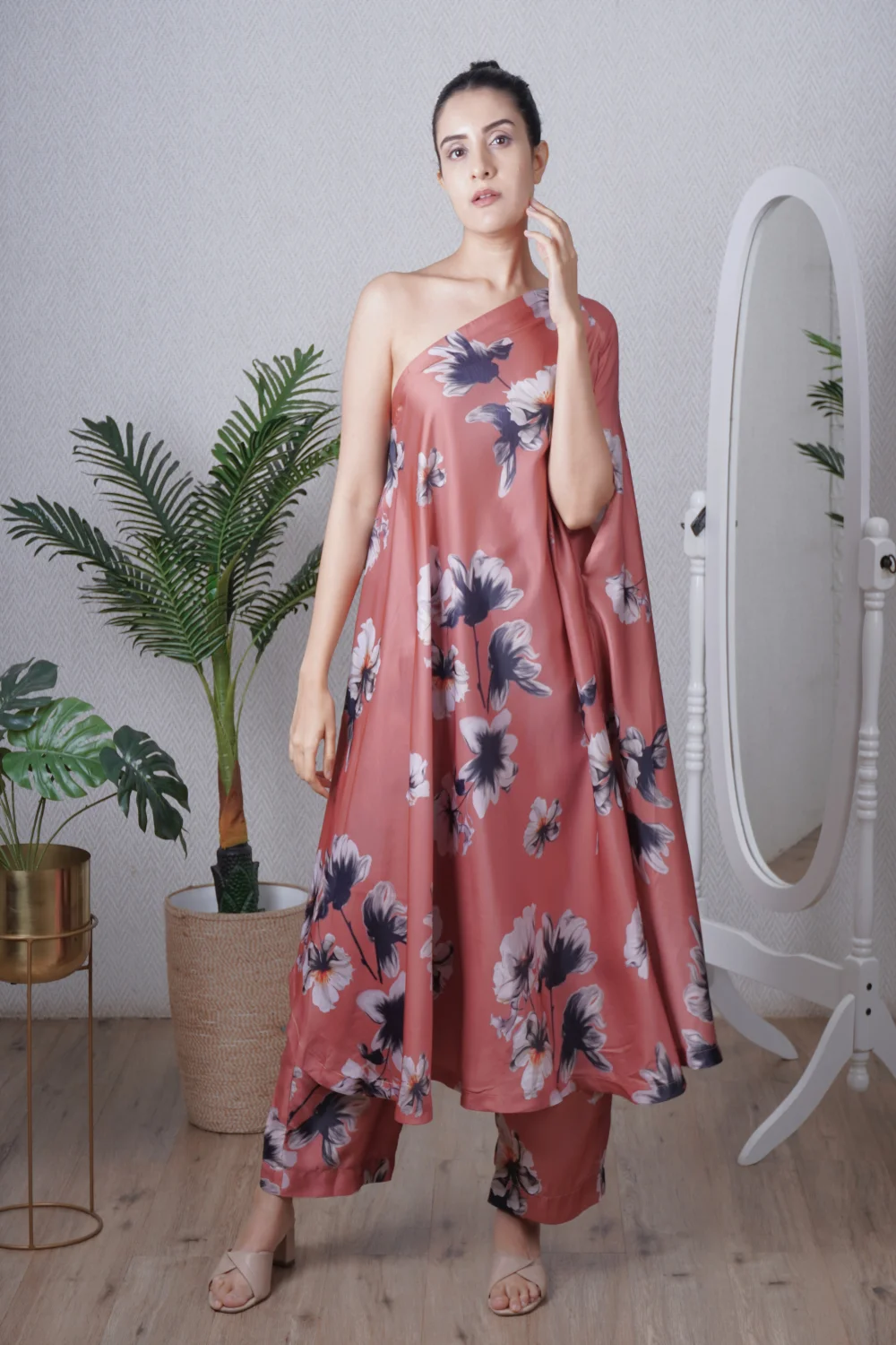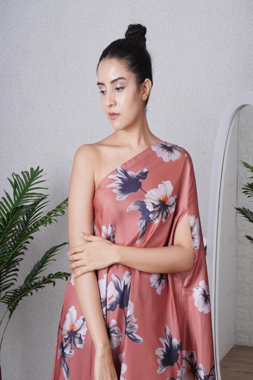 Mocha one shoulder kaftan paired with a straight pant, can be worn as a dress also. Super comfortable and breathable that you can live in this throughout the day.