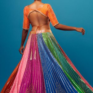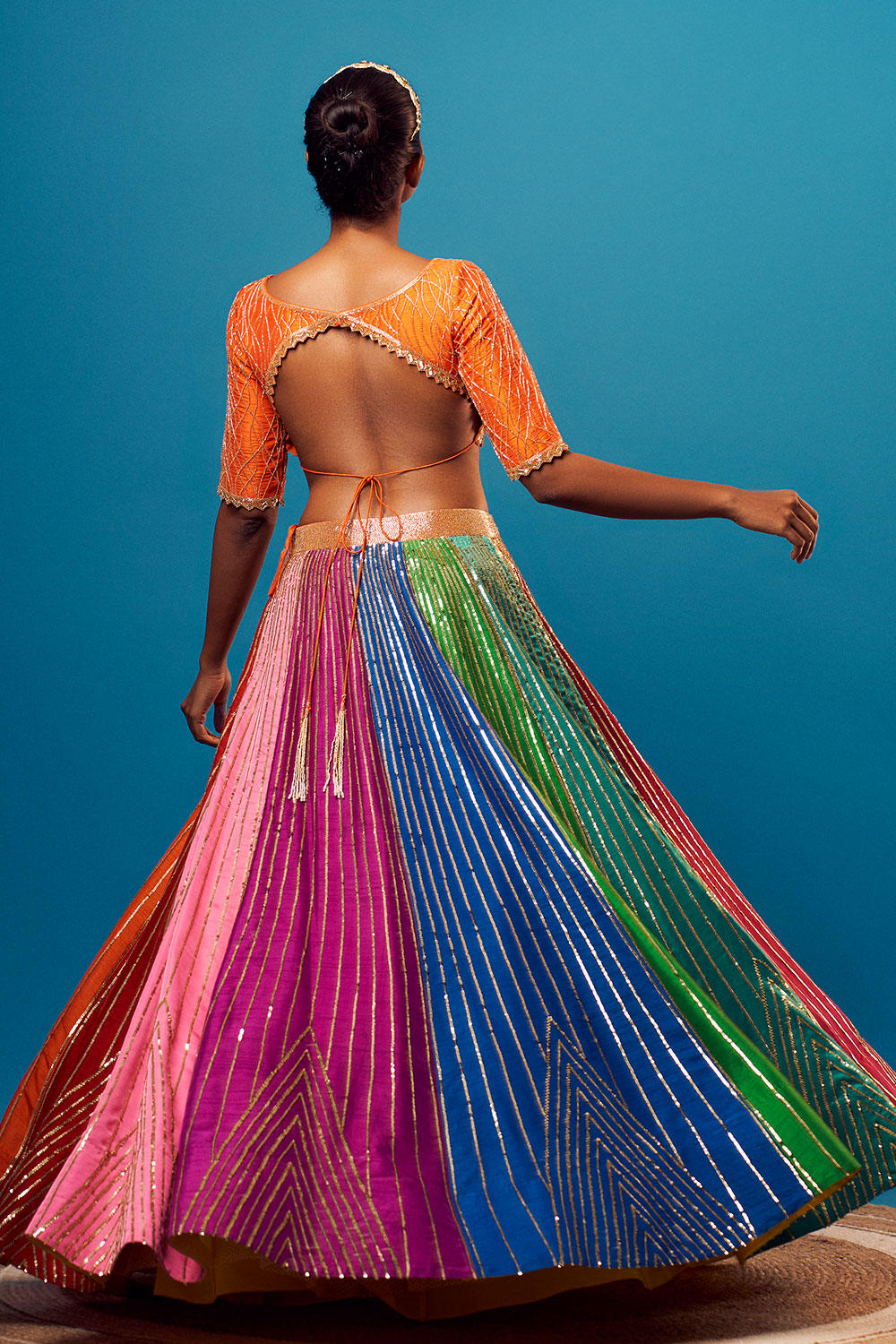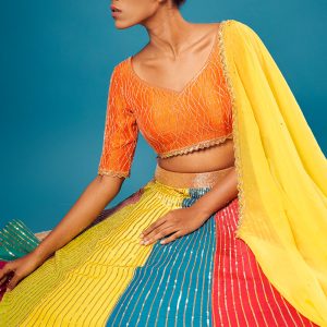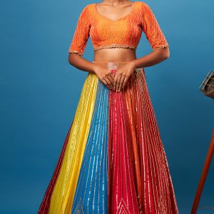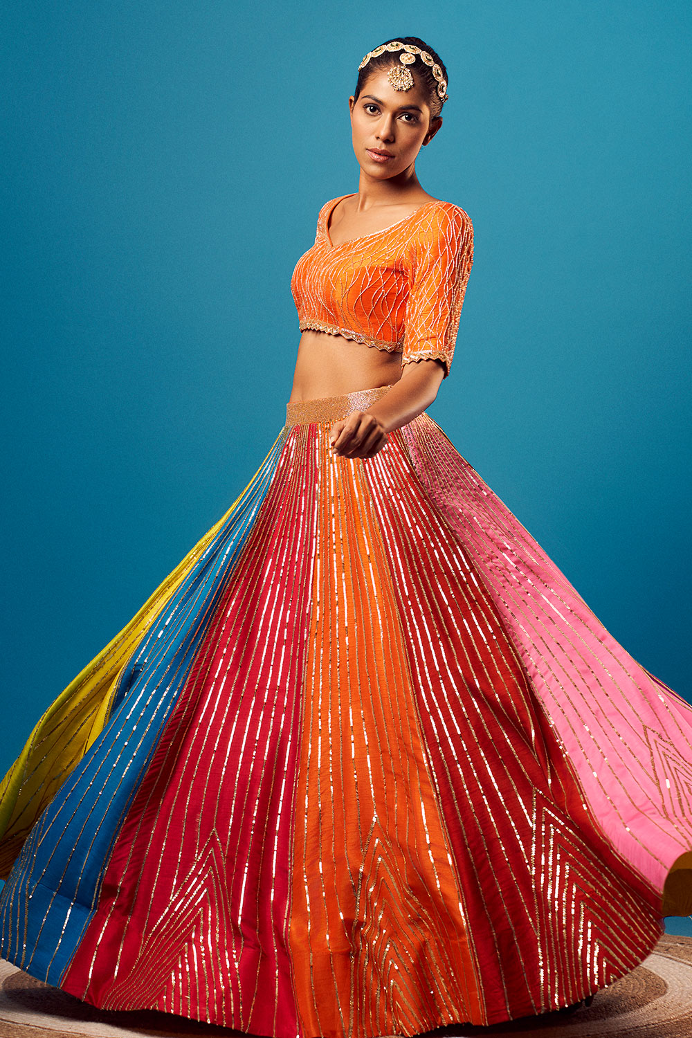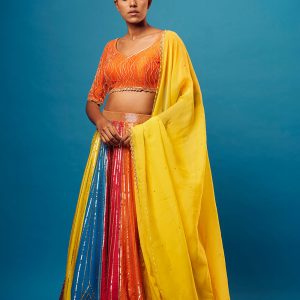 Orange cutdana embroidered blouse with multi panel sequin embroidered lehenga and yellow embroidered organza dupatta.