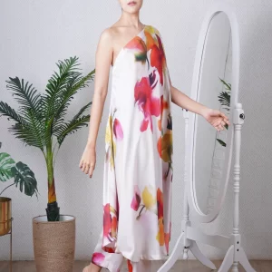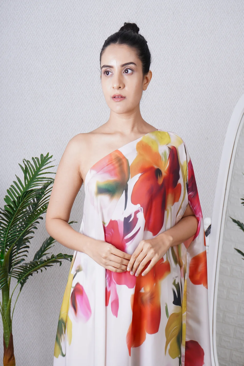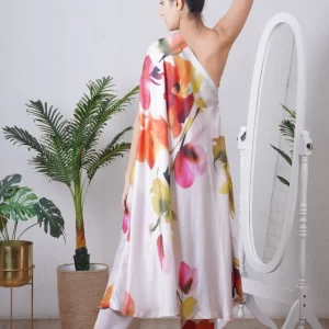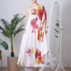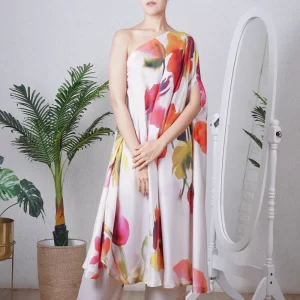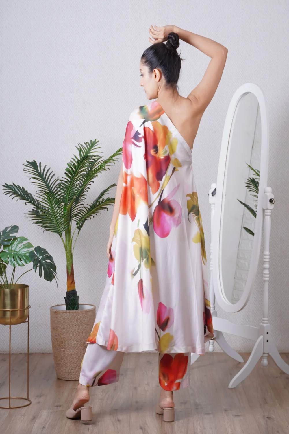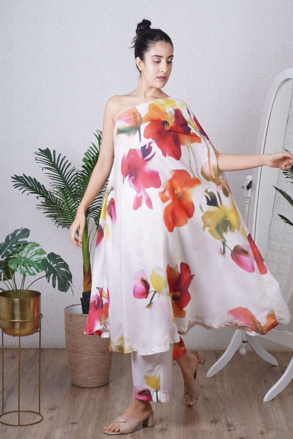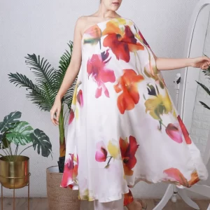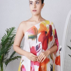 Multi colour print one shoulder kaftan paired with a straight pant, can be worn as a dress also. Super comfortable and breathable that you can live in this throughout the day