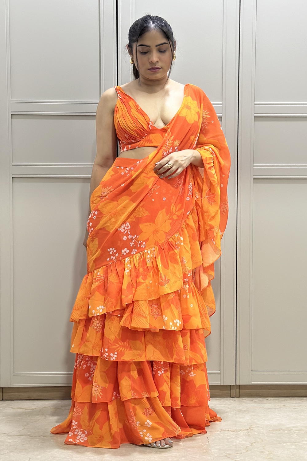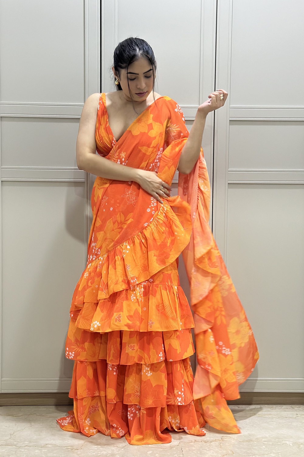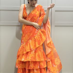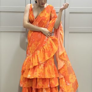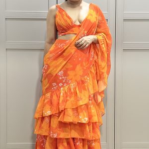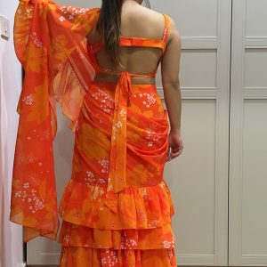 Orange Georgette Printed Ruched Blouse with Tiered Ruffle Skirt and Ruffle Long Dupatta Draped as Saree Pallu
