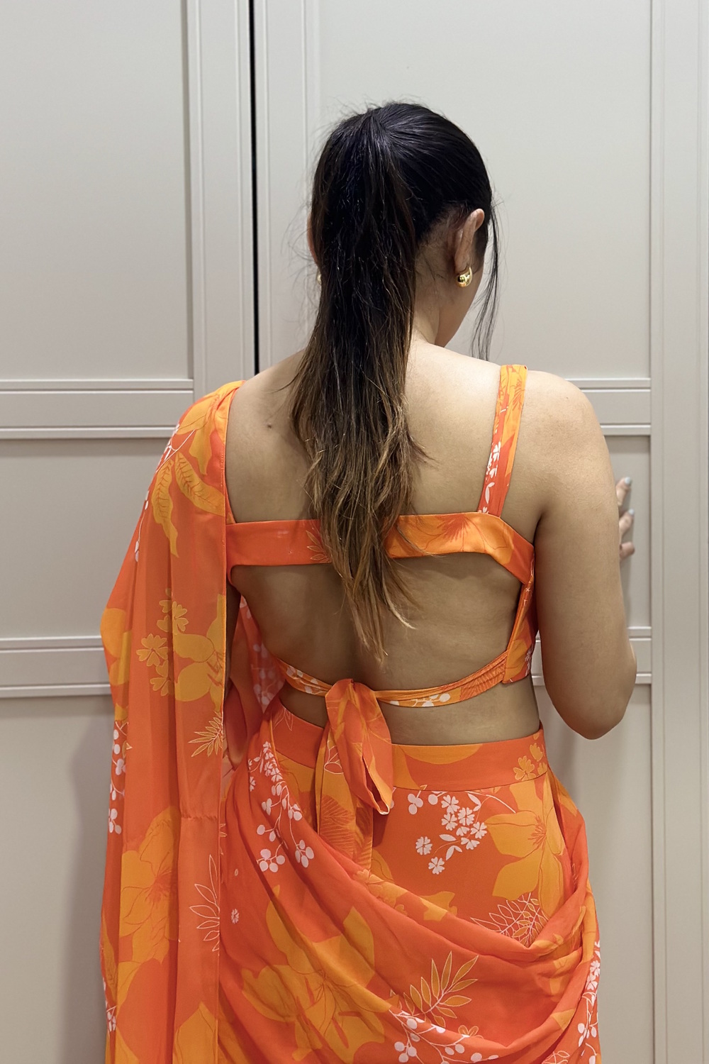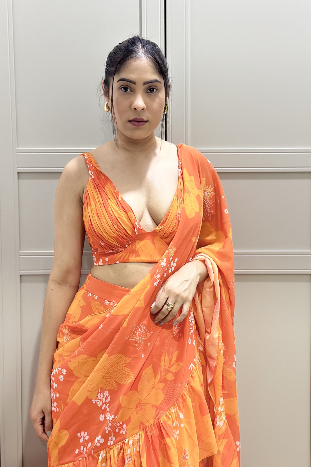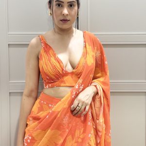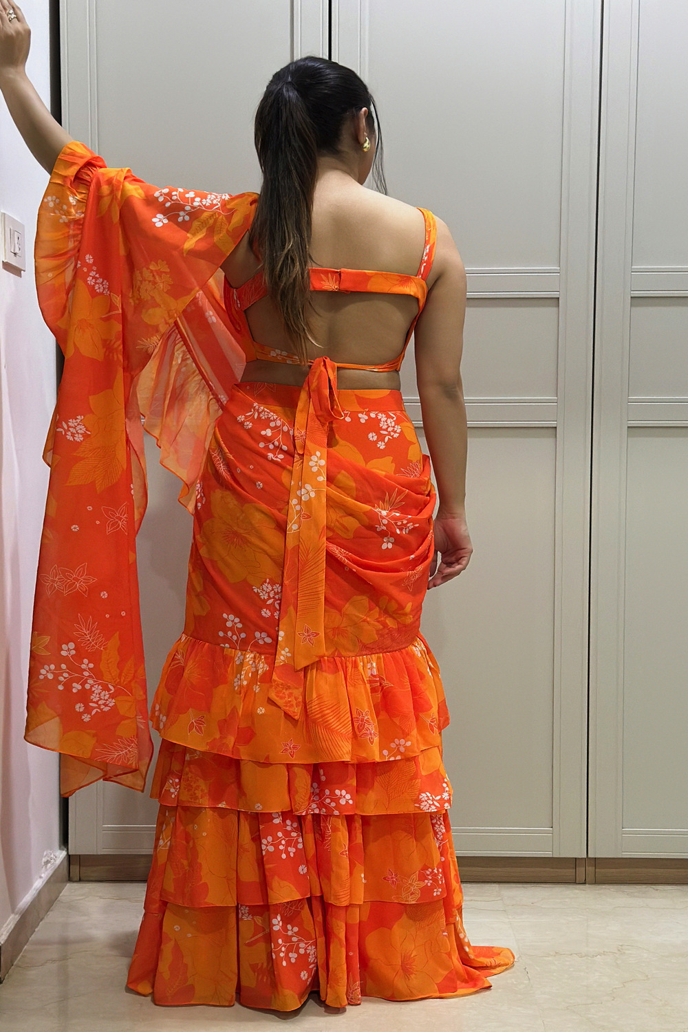 Orange Georgette Printed Ruched Blouse with Tiered Ruffle Skirt and Ruffle Long Dupatta Draped as Saree Pallu