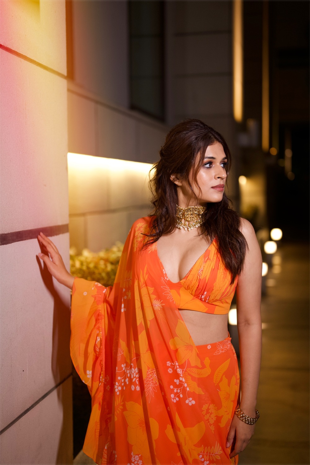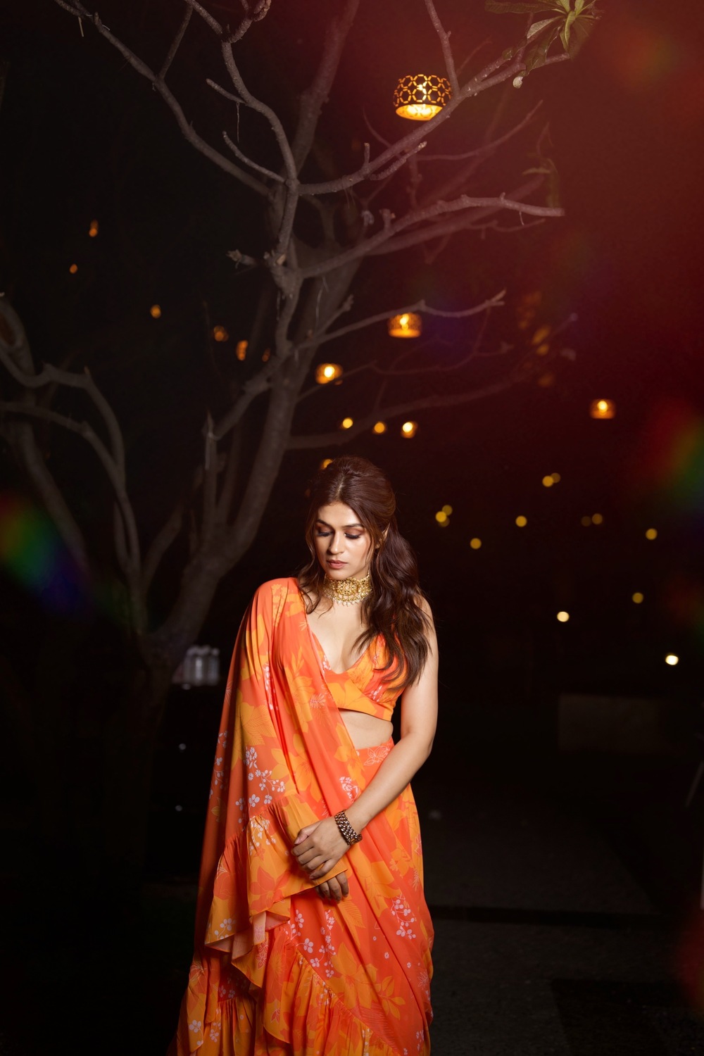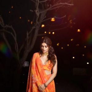 Yellow/orange printed ruched blouse with skirt  and 3.5 mtrs long dupatta with ruffles which is draped like a sari.
