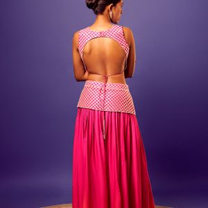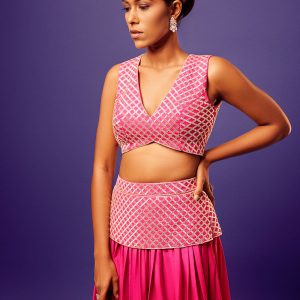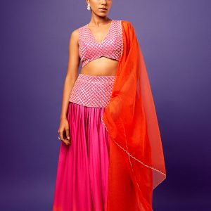 Pink Criss-Cross Embroidered Imported Crepe Blouse with matching Pink Ombre Criss-Cross Embroidered Jasmine Palazzo and Orange Scallop Embroidered Organza Dupatta