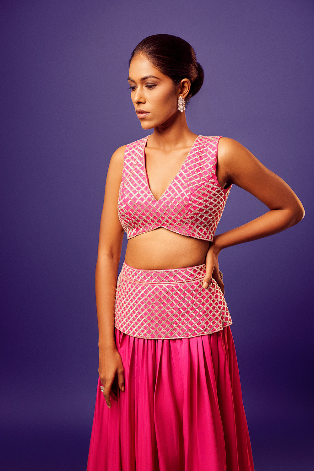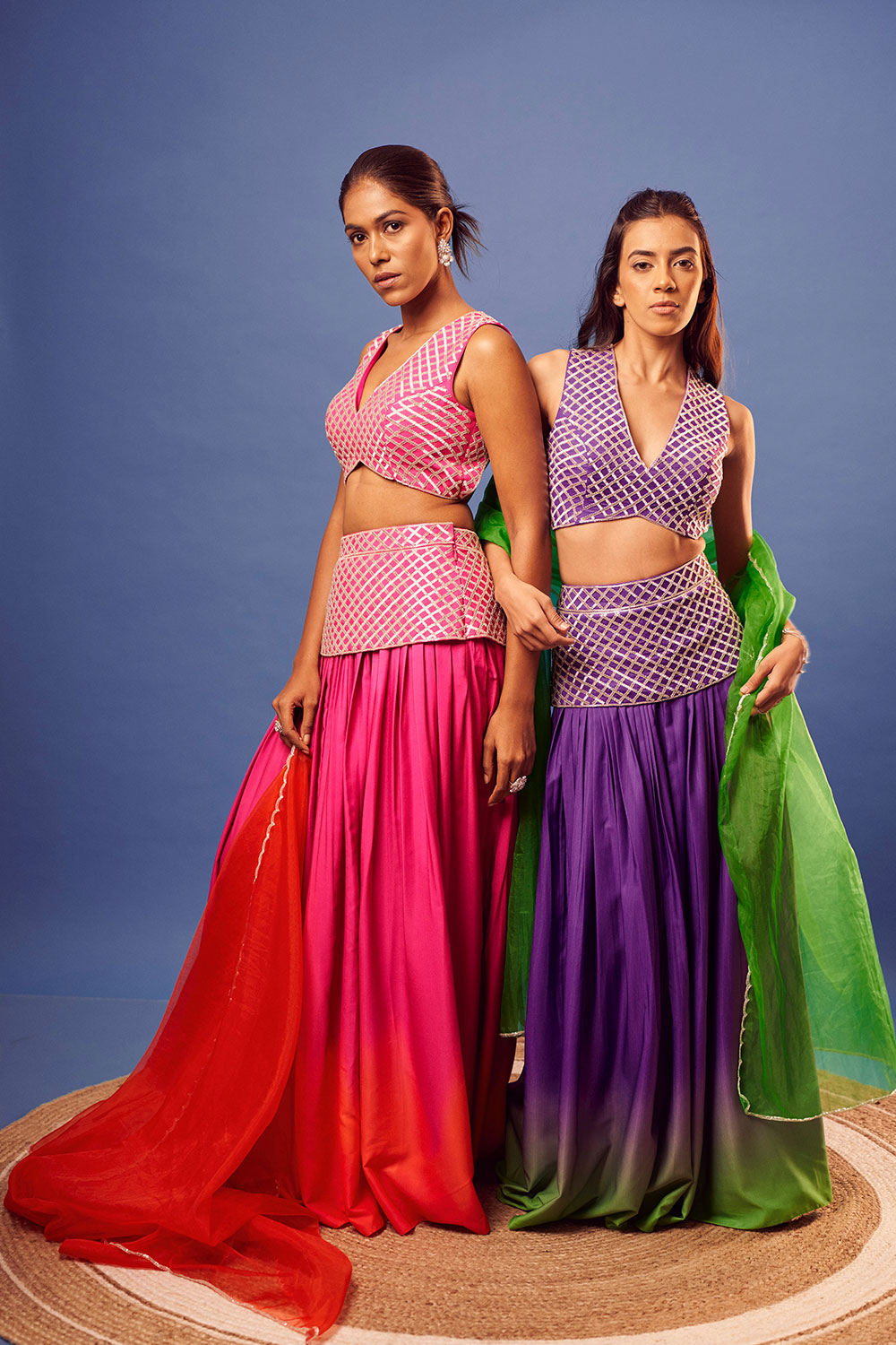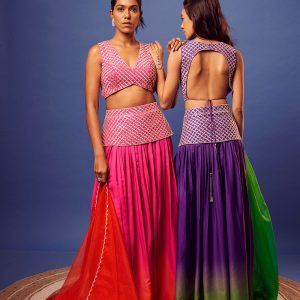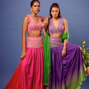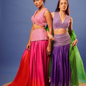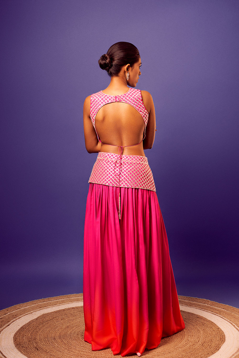 Pink salli criss-cross work blouse with matching embroidery shaded pink-orange palazzo and orange scallop embroidery dupatta.