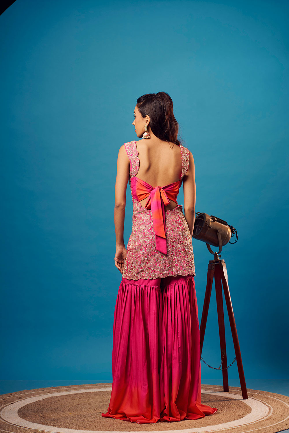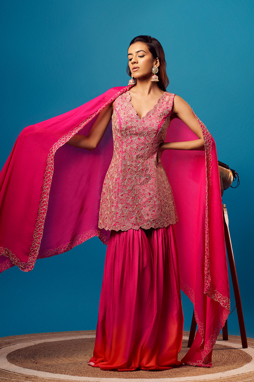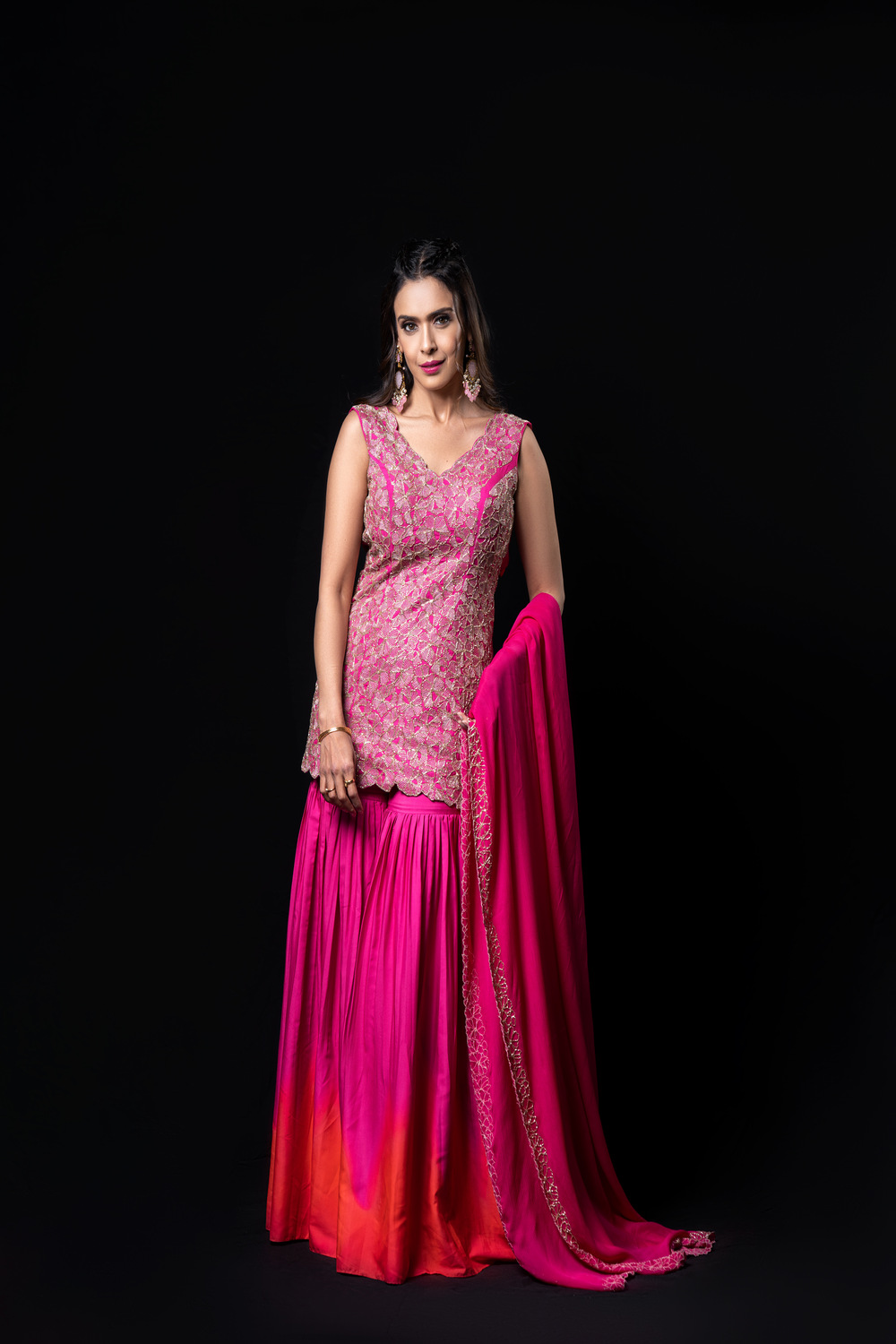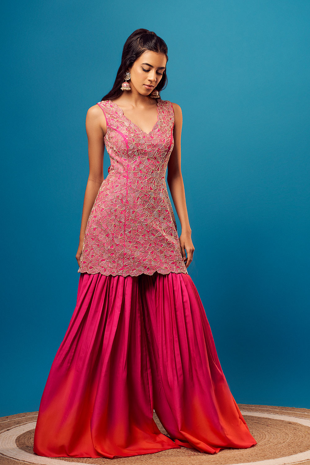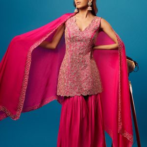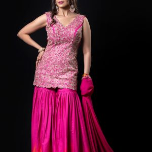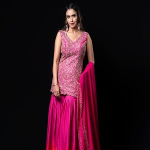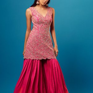 Pink cutdana floral embroidered short kurti with matching shaded pink-orange sharara and hot pink chinon floral border dupatta.