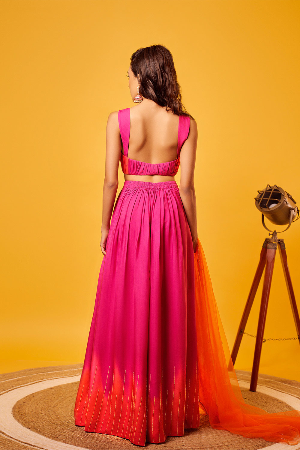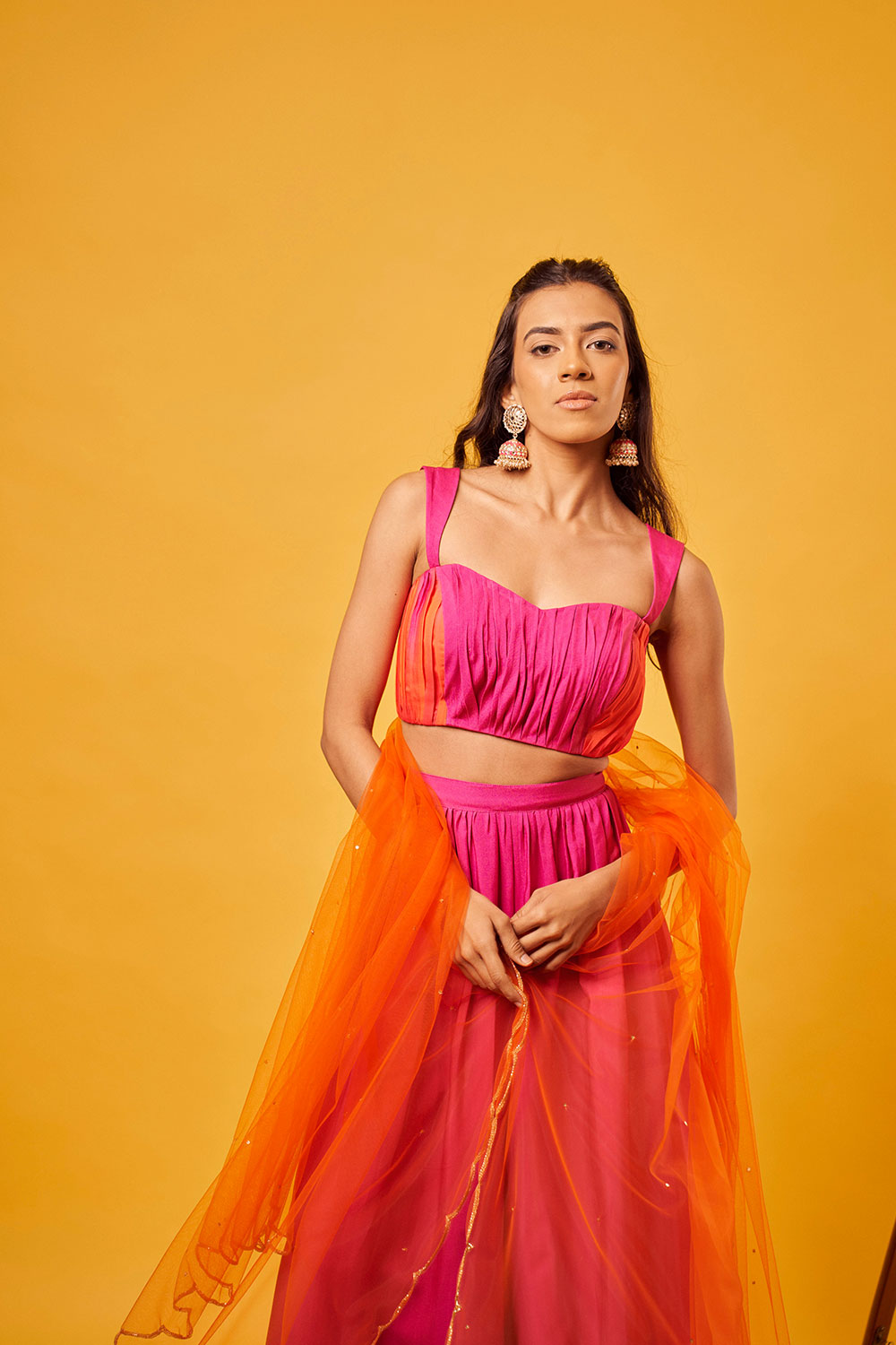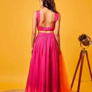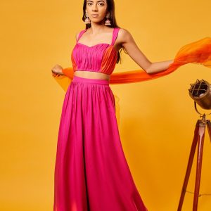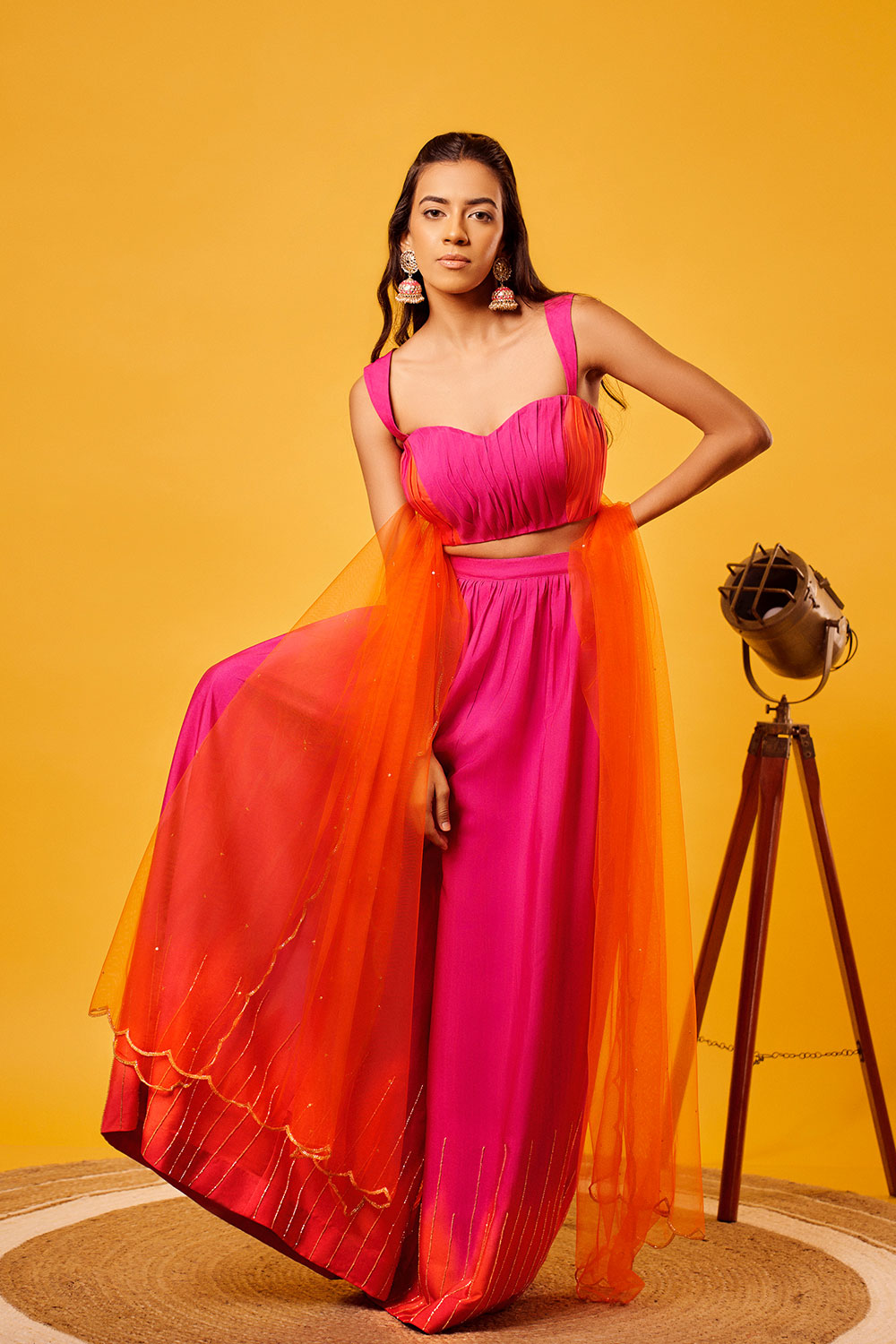 Pink-Orange Ombre ruching blouse with shaded pink-orange vertical cutdana embroidery palazzo and orange scallop embroidered net dupatta with sequin highlights.