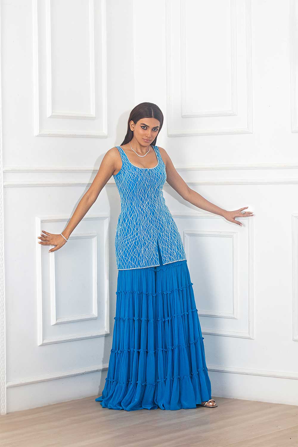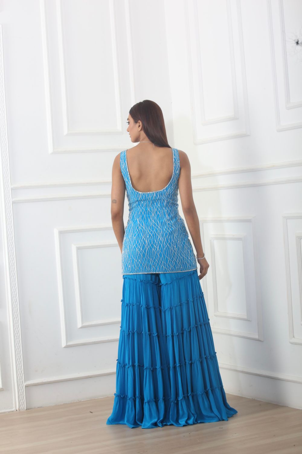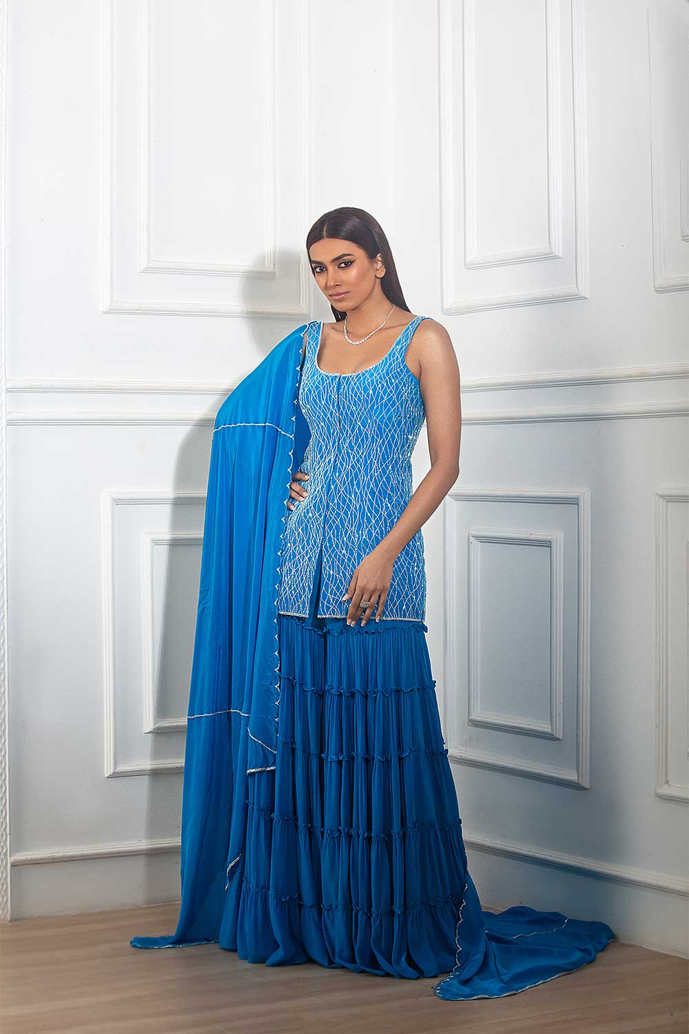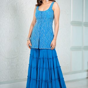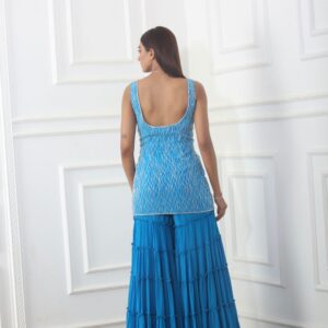 Teal blue heavy cutdana embroidered kurti with matching tiered sharara and cutdana embroidered scallop dupatta set.