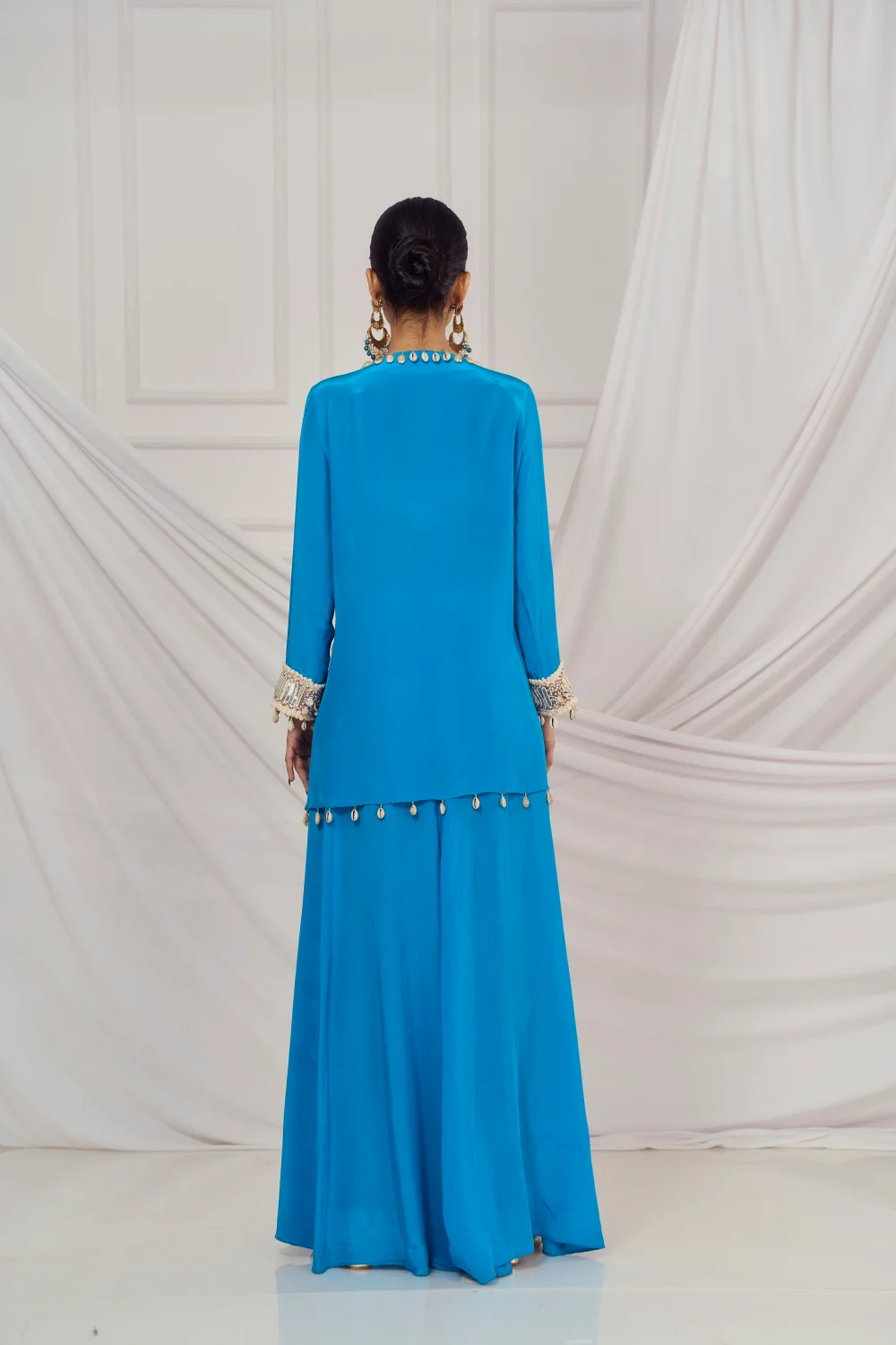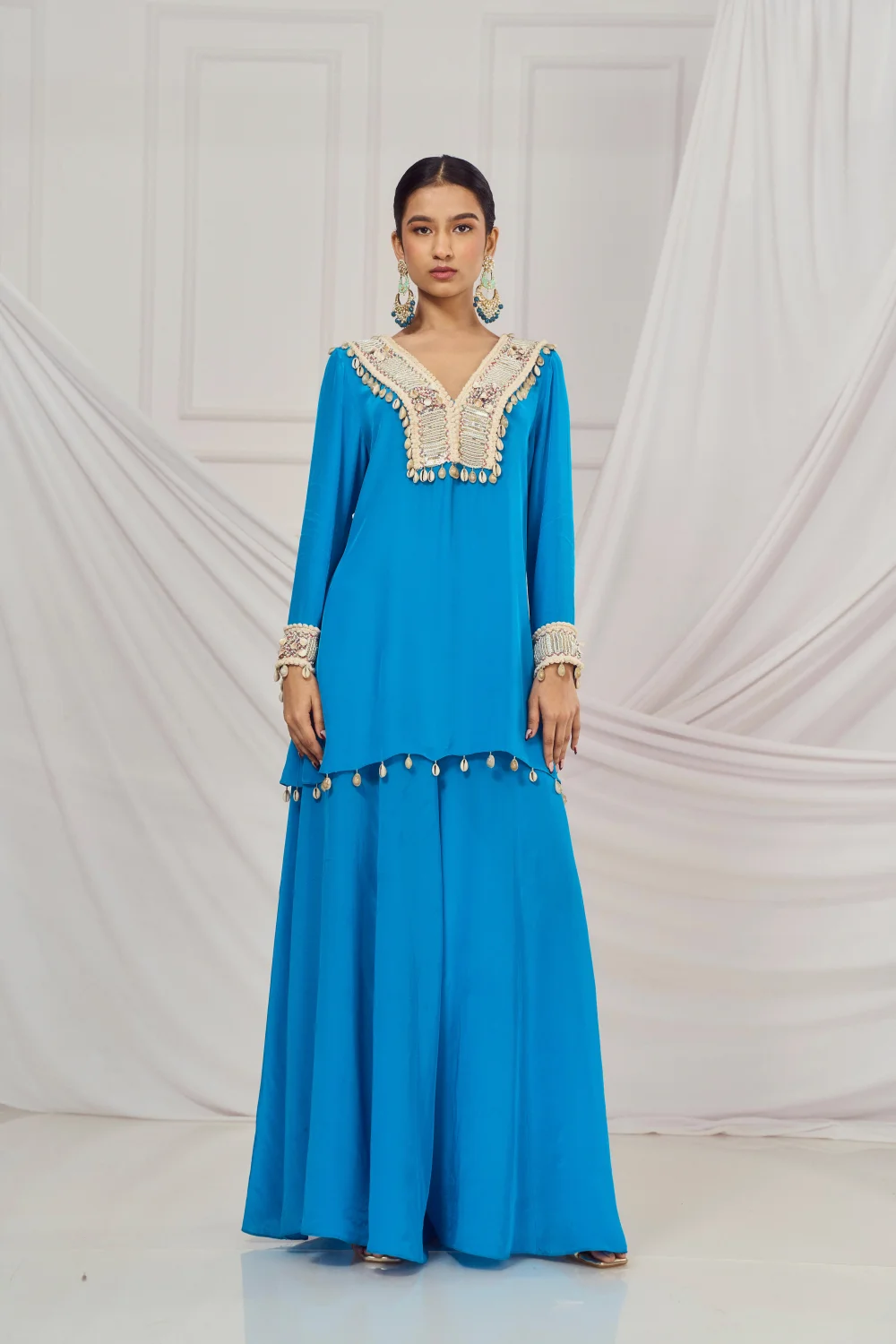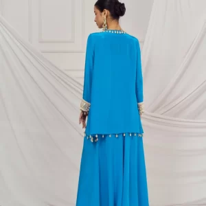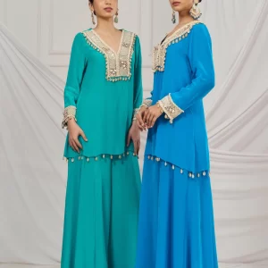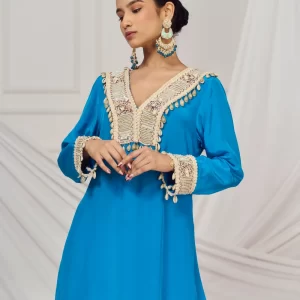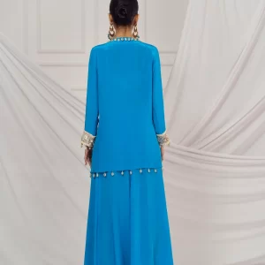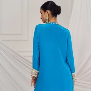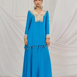 Teal blue embroidered kaftan set paired with matching flared palazzo.