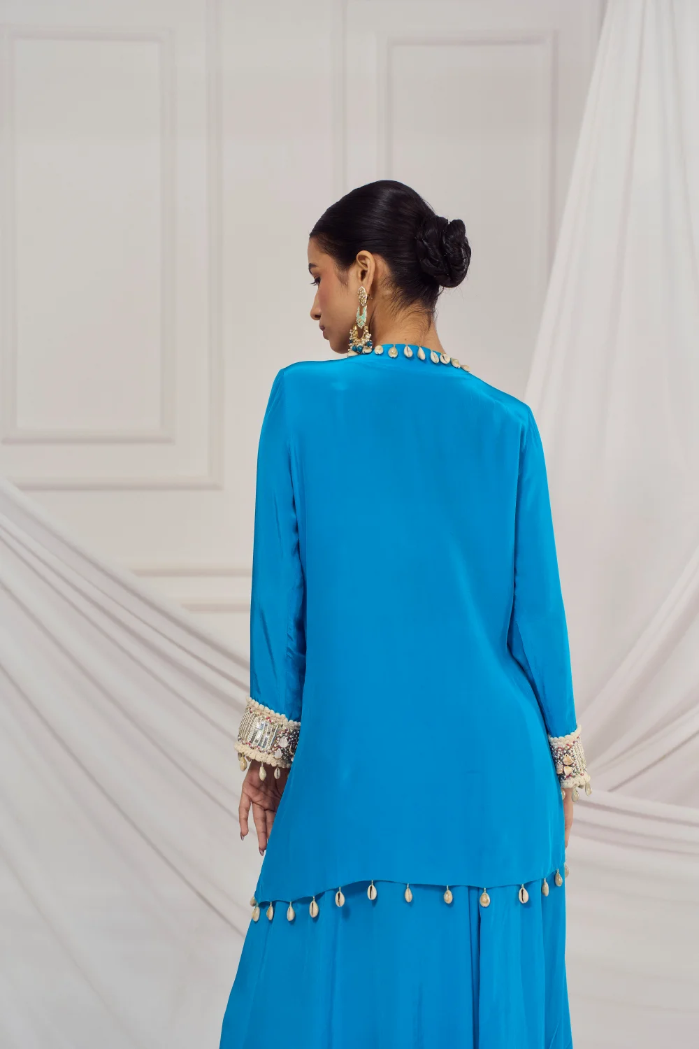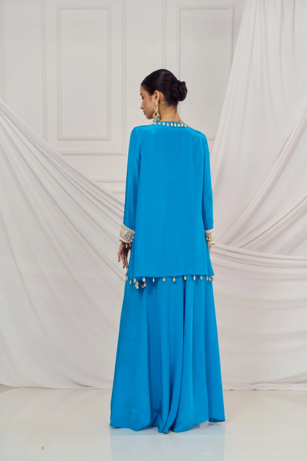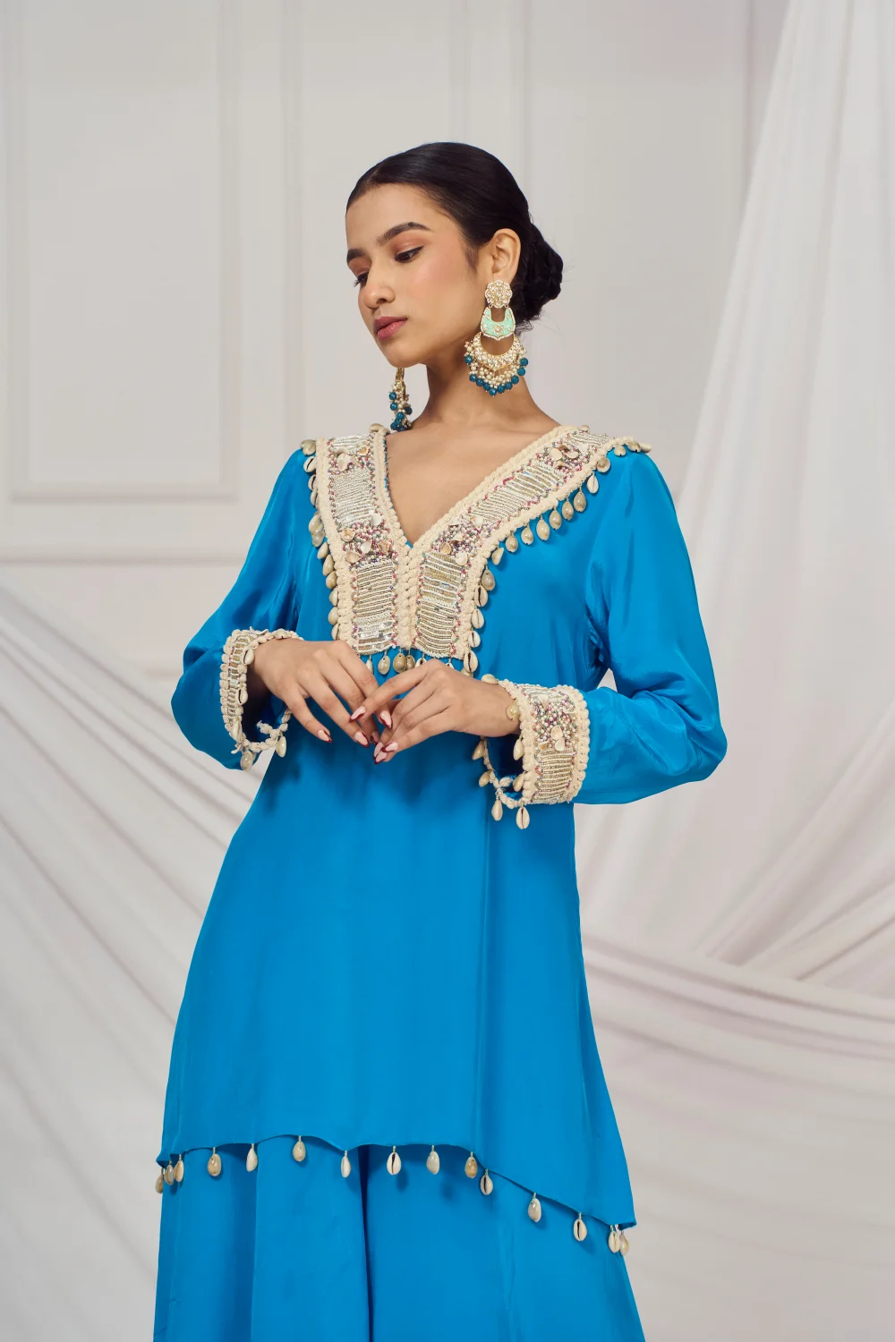Teal blue embroidered kaftan set paired with matching flared palazzo.