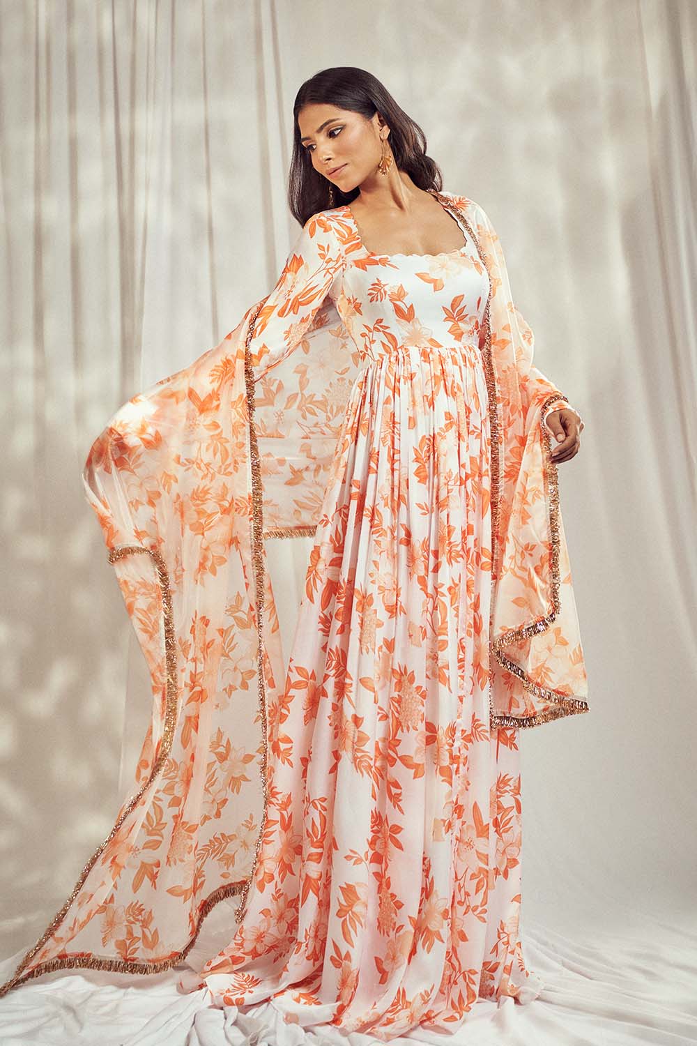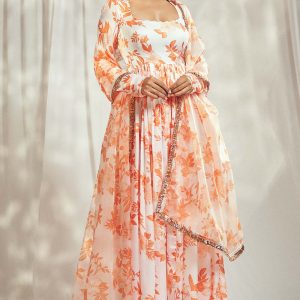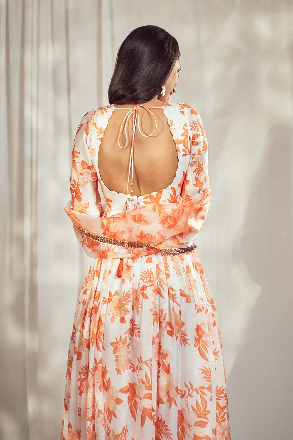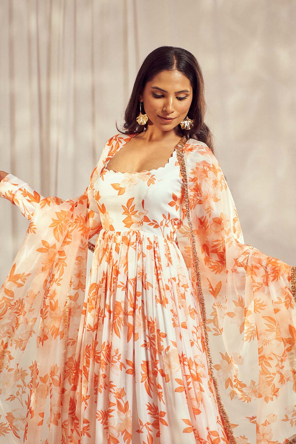 Burnt Orange print self scallop anarkali with matching organza silk dupatta with gold trimming lace detailing.