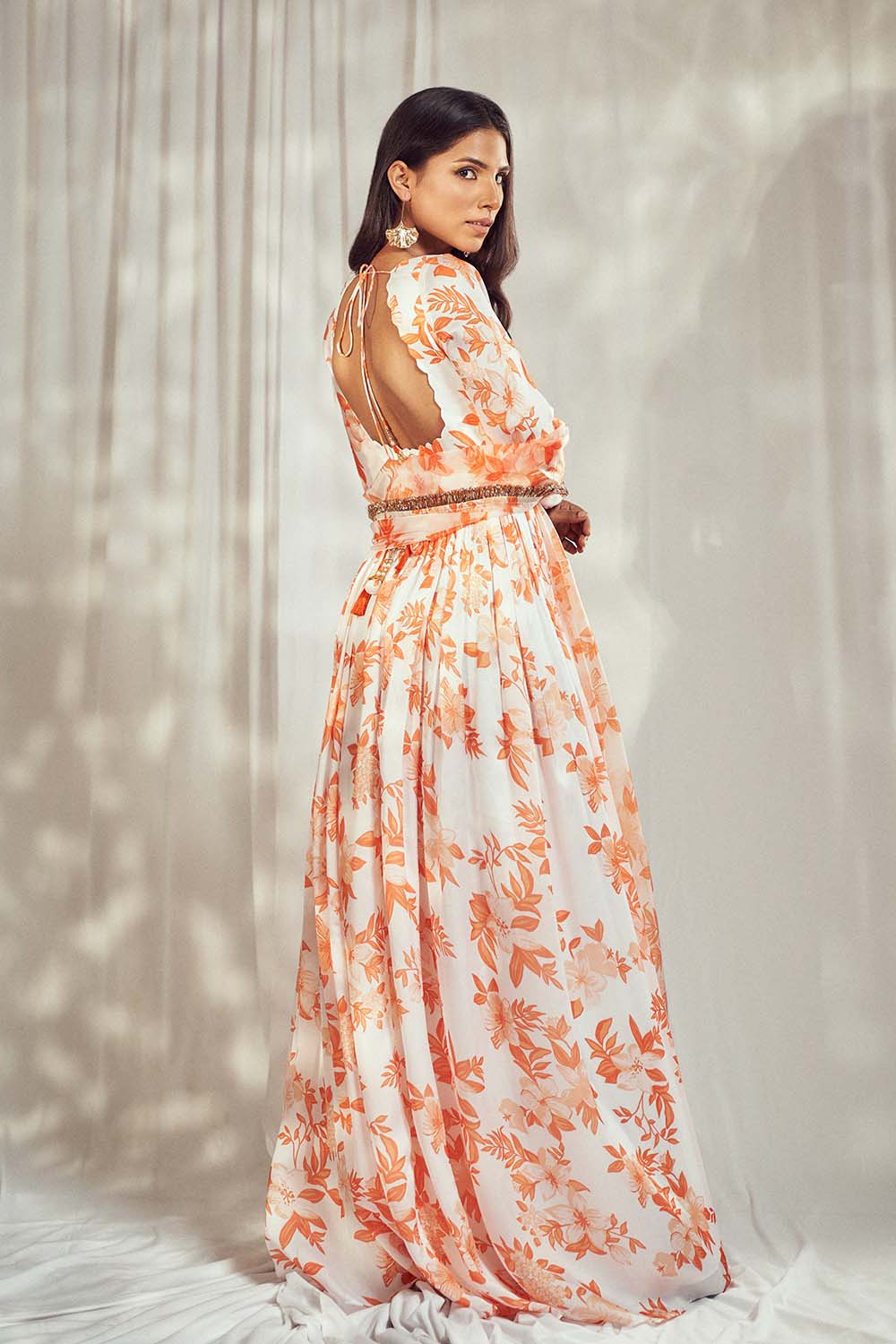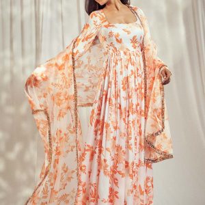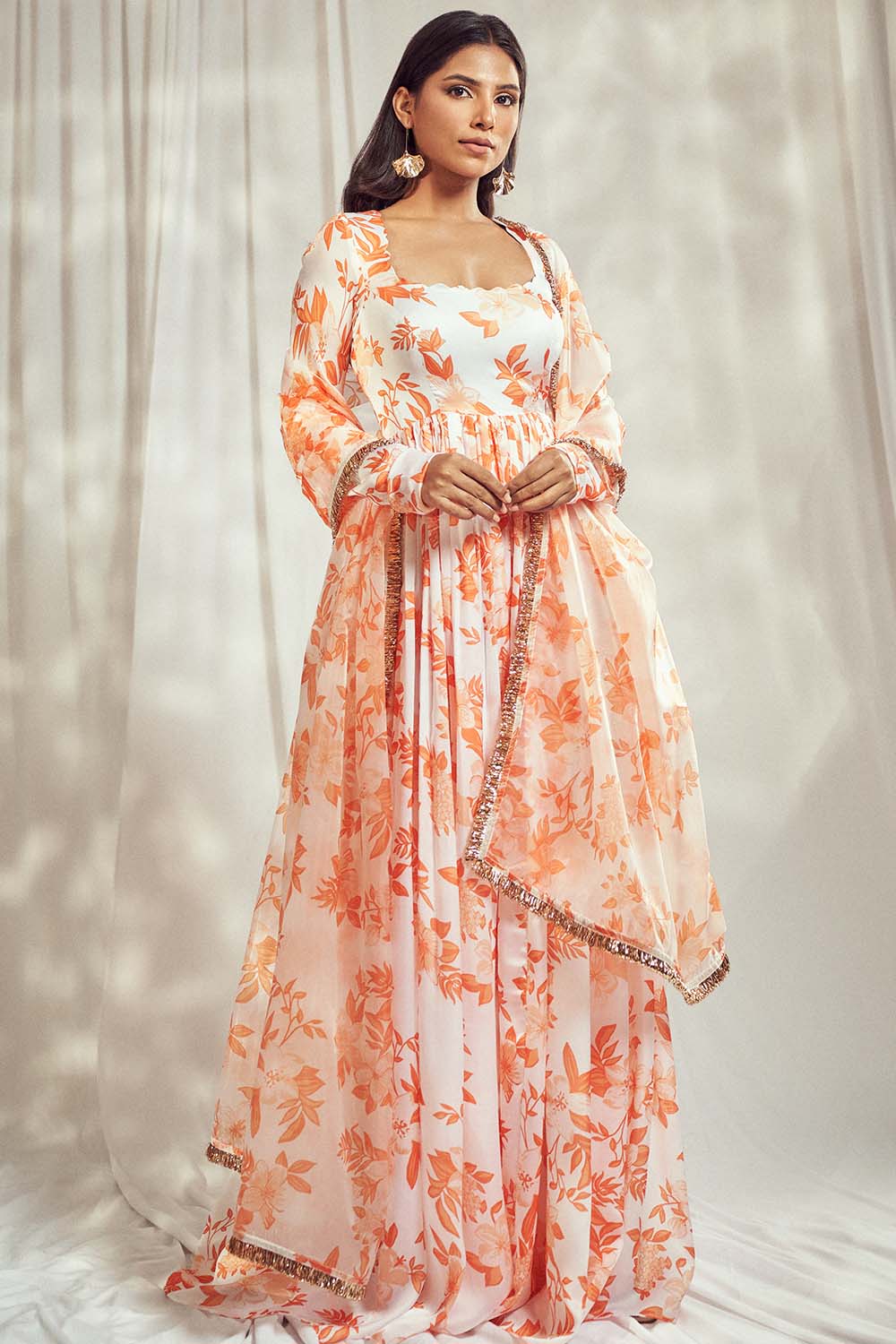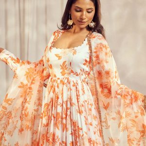 Burnt Orange print self scallop anarkali with matching organza silk dupatta with gold trimming lace detailing.