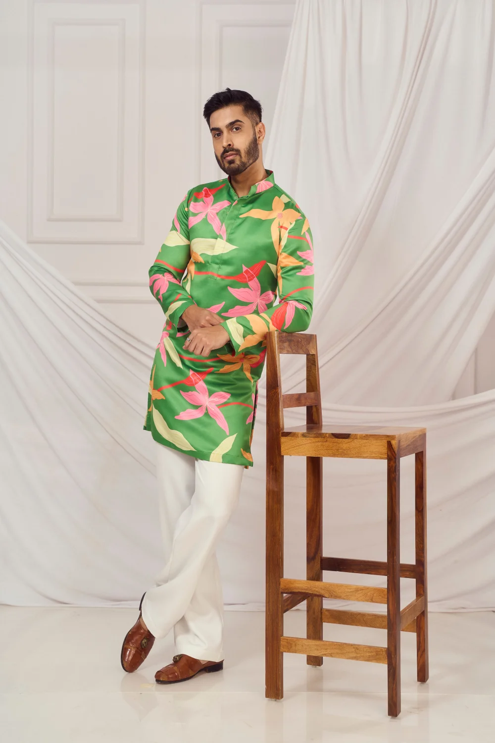 Leaf Green Floral Print Satin Silk Kurta.