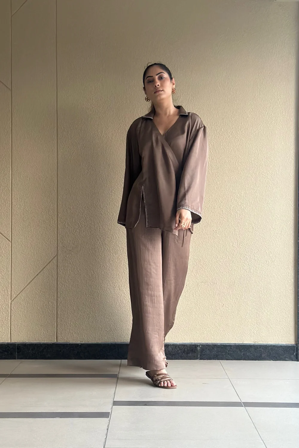 Mocha Overlap Shirt with Pant Set.