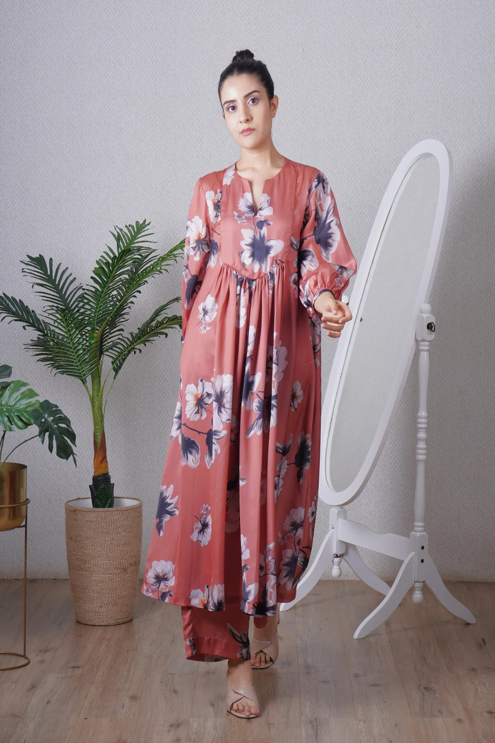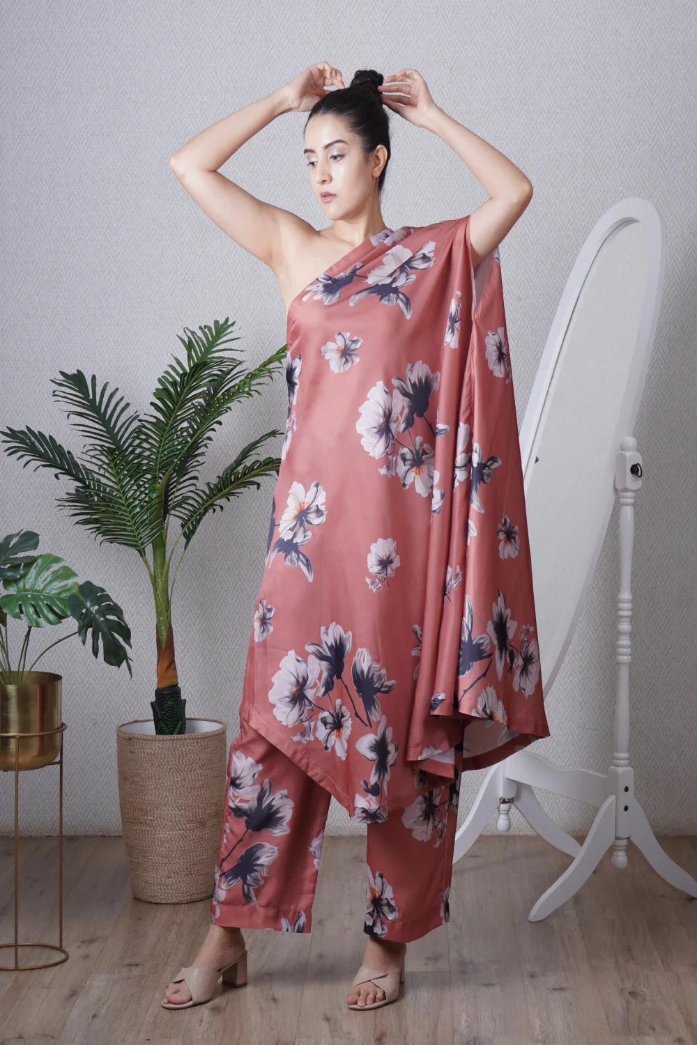 Mocha Imported Satin One Side Kimono Co-ord Set.
